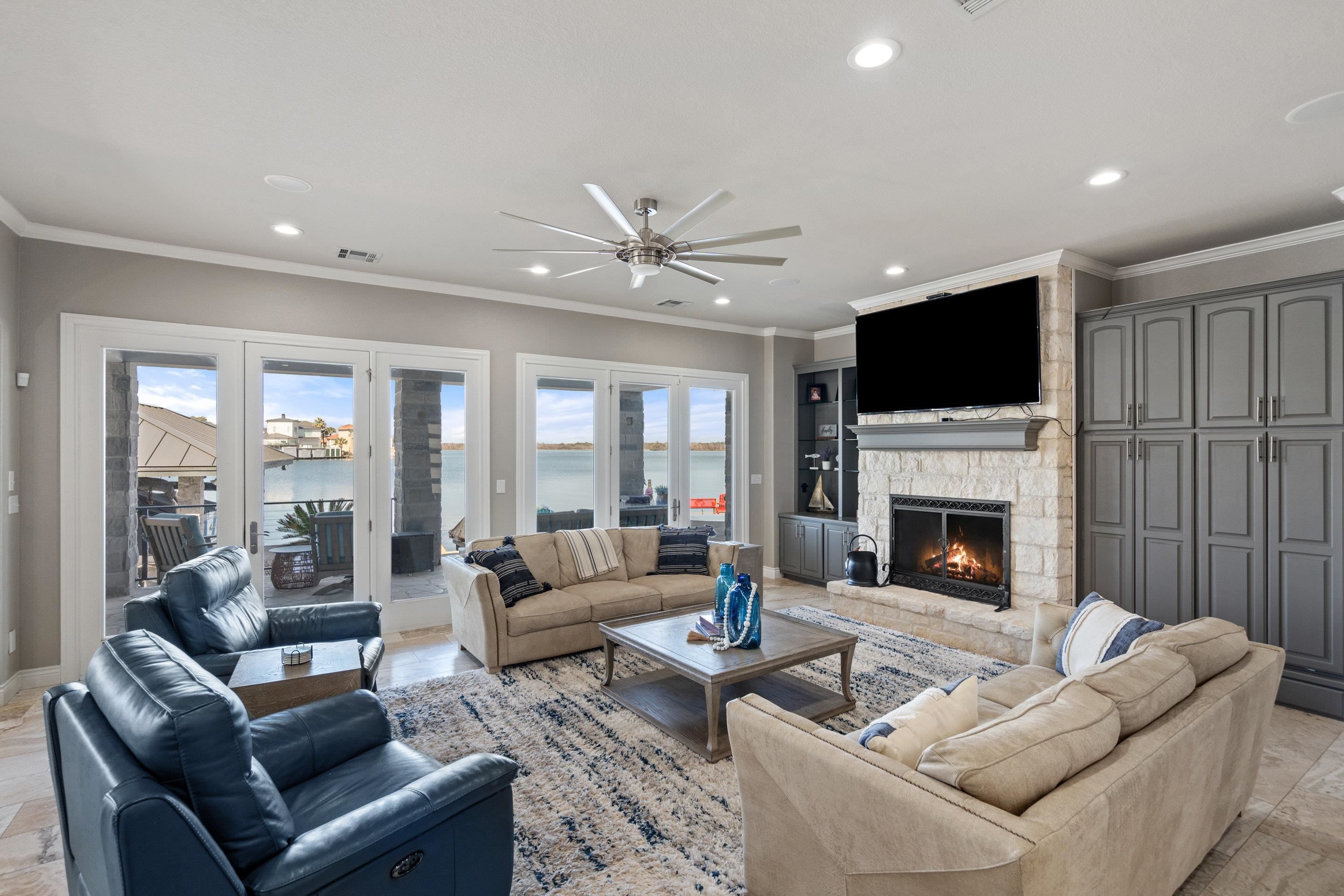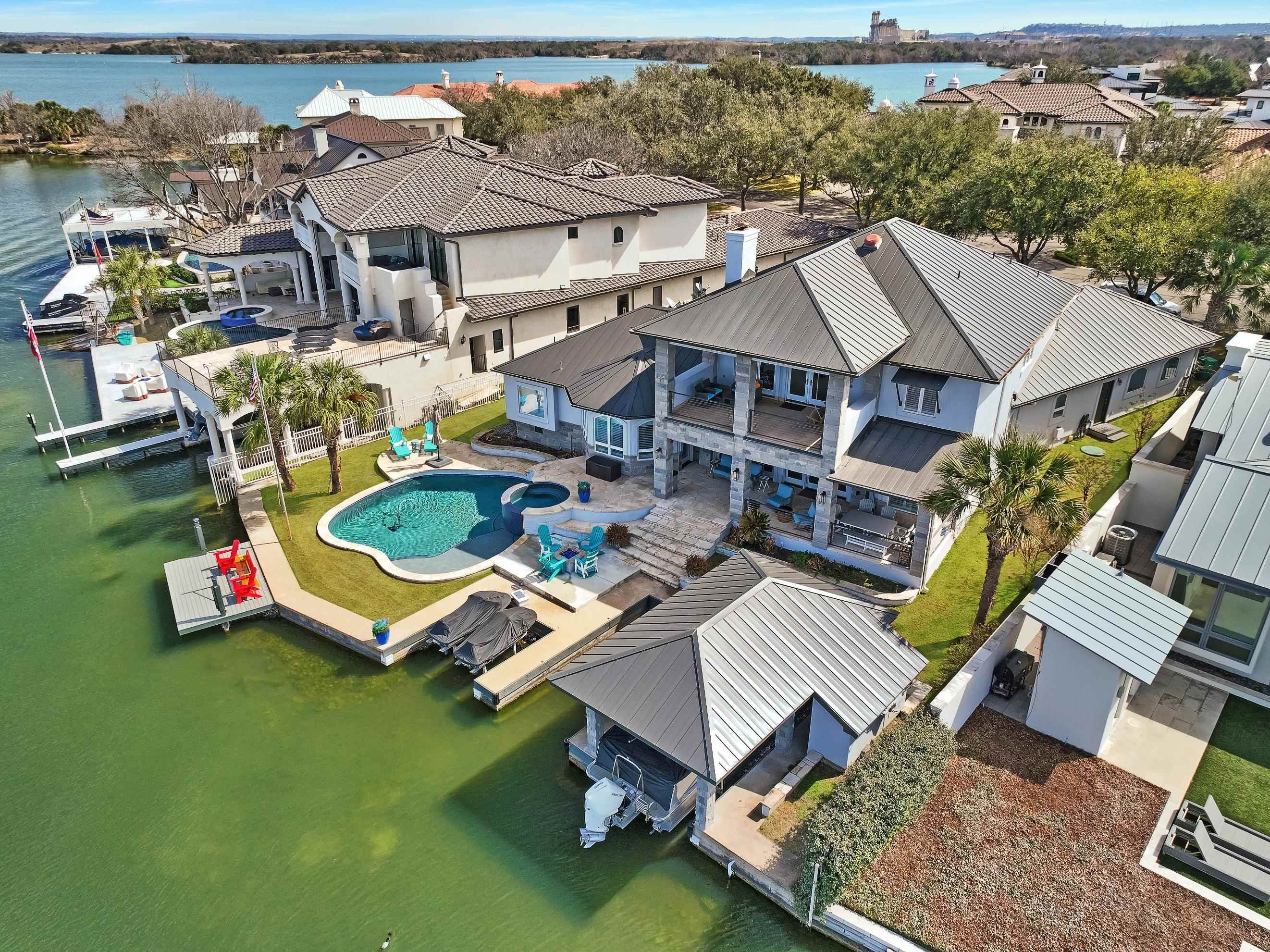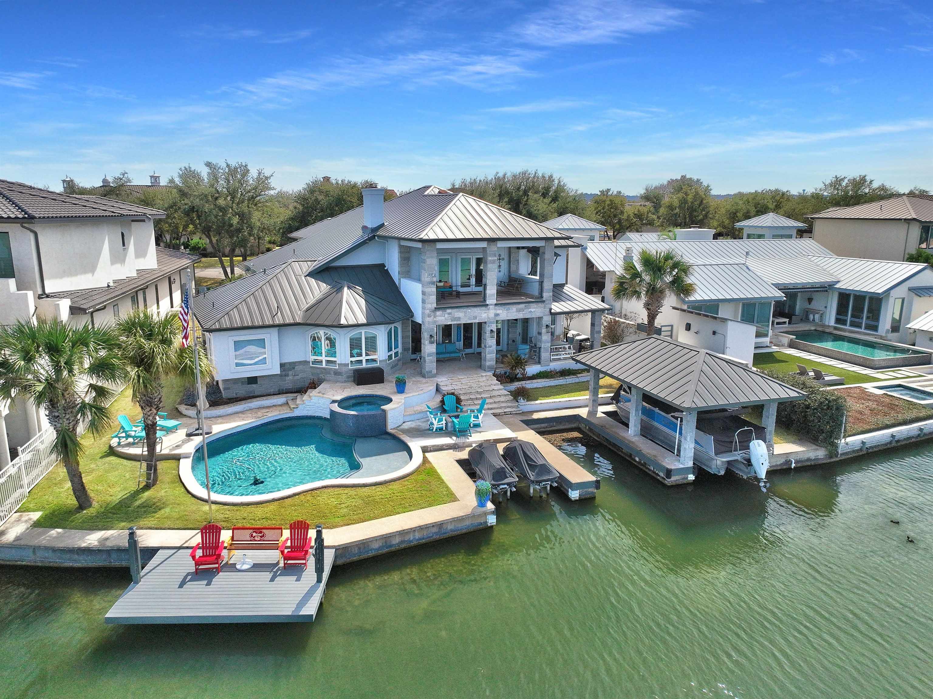 Matern Island isn’t just a place — it’s a lifestyle. This 0.33-acre estate boasts 100 feet of prime Lake LBJ shoreline in one of Horseshoe Bay’s most coveted communities. Start mornings with coffee on the Trex deck and spend afternoons on the water with your private boat slip, electric lift, and 2 jet ski lifts. Prefer dry land? Relax by the in-ground pool, spa, and splash pad, or gather around the stone patio’s gas fireplace for golden-hour views. Built-in speakers keep the vibes flowing, indoors and out. Inside, lakeside luxury takes center stage. The living room’s floor-to-ceiling windows frame panoramic water views, while the stone wood-burning fireplace and built-in audio system set the mood. The kitchen is a chef’s dream with a Z-Line 6-burner gas stovetop, granite island, and wine bar perfect for entertaining. The main-level owner’s suite is a private sanctuary with unobstructed lake views, private patio access, and a spa-inspired bath featuring an oversized soaking tub, walk-in shower, and a custom closet perfect for any wardrobe. Upstairs, guests enjoy lake-view suites and a family room with direct balcony access overlooking the lake — the perfect spot to unwind after a day on the water. With gated community privacy, meticulous landscaping, and smart home features — plus Horseshoe Bay Resort just minutes away — this home delivers the ultimate lake life. Why dream it? Live it. Let’s get you on the water!