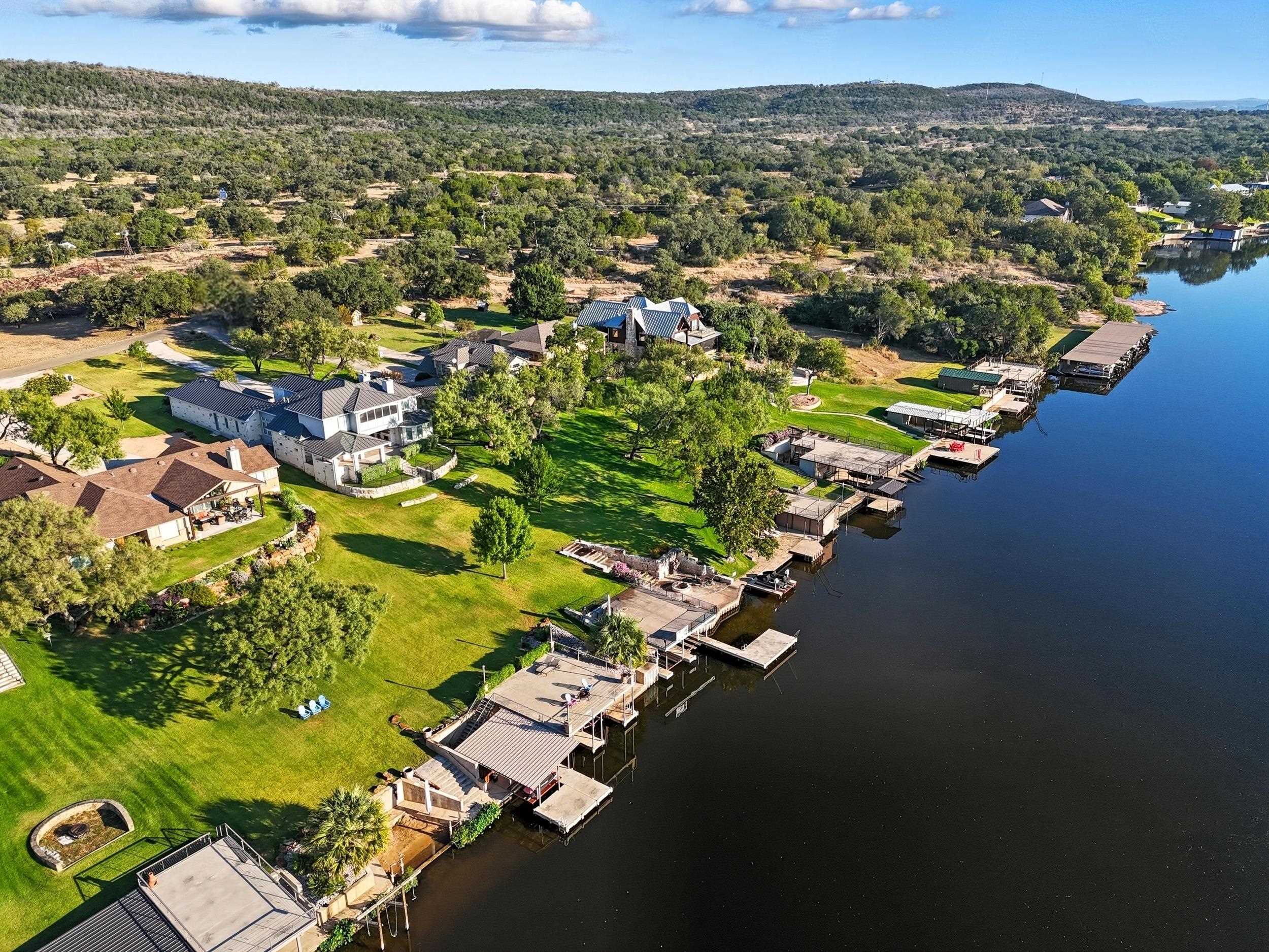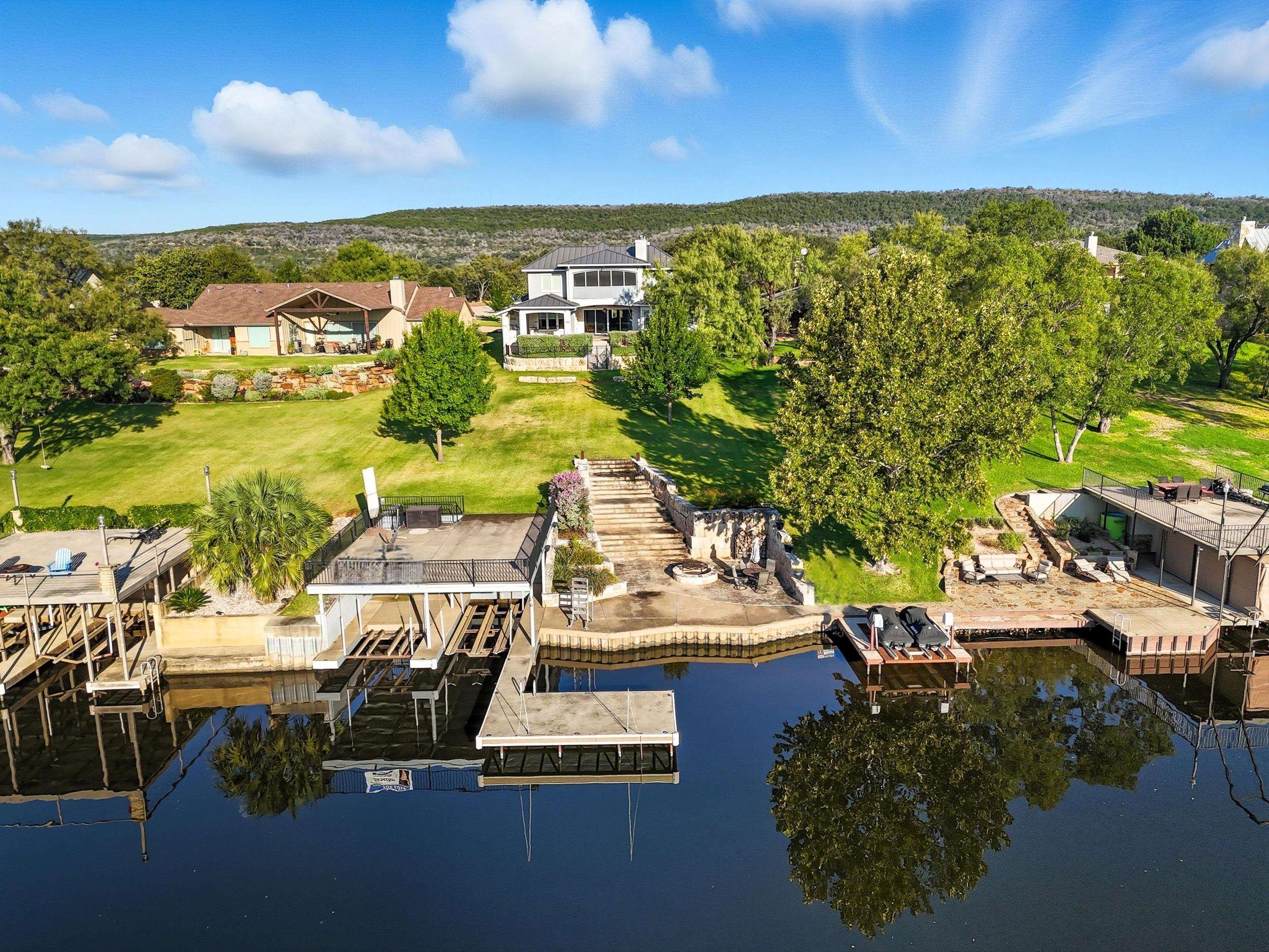 Stunning Custom Lakefront Home on the Upper Colorado Arm of Lake LBJ Welcome to this beautifully crafted, custom built home offering 77 ft of waterfront where you’ll create memories that last a lifetime. Designed for entertaining and effortless waterfront living, this property is located in a gated community and truly has it all. Step inside the 5-bed, 5.5-bath home featuring a wide open floor plan with gorgeous granite countertops, custom cabinetry, and expansive living spaces designed to capture panoramic lake views. Large, beautiful windows span the back of the home, flooding the interior with natural light and providing seamless access to the covered patio. Outdoor living is equally impressive with a covered patio featuring a complete outdoor kitchen, built-in grill, kegerator, and outdoor TV are ideal for dining or relaxing while enjoying the lake views. The lower-level patio and fire pit provide additional entertaining space, all beautifully lit by automated landscape lighting that enhances the home’s curb appeal. For the water enthusiast it features a private covered boat dock and two Seadoo lifts, offering effortless access to endless lake days. The main level primary suite is designed to impress, its spa-like bathroom, large walk-in shower, beautiful clawfoot tub, dream closet with ample space for clothes, shoes, and accessories, all connected to the laundry room. This rare property offers the perfect blend of luxury, comfort. Don’t miss your chance to own this incredibile piece of paradise.