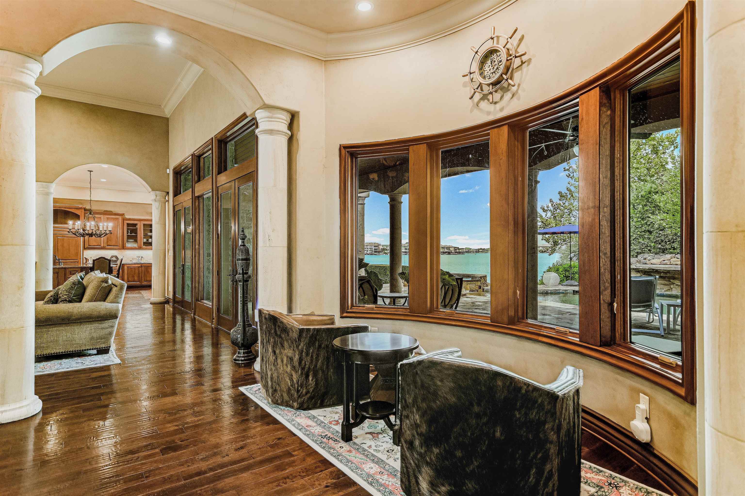 Gorgeous custom waterfront home in Horseshoe Bay offering 136 feet of prime Lake LBJ frontage with stunning open-water views. Set on a peaceful cul-de-sac, the home is framed by lush, park-like landscaping. Designed for effortless lakefront living and entertaining, the home showcases soaring ceilings and wall-to-wall windows that flood the interiors with natural light and sweeping panoramic views. Rich wood floors span the main level, where the great room centers around a striking Travertine fireplace and adjoins the formal dining room. The gourmet kitchen includes a casual dining space overlooking the lake, walk-in pantry, gas cooktop, double ovens, Sub-Zero refrigerator, and new dishwasher, compactor and ice maker. The main-level primary suite offers relaxing lake views, a private sitting area/library, spa bath with dual vanities, his-and-hers closets, walk-in shower, soaking tub and adjoining exercise room. Two additional ensuite bedrooms, a wine room, powder bath, laundry and study with fireplace complete the main floor. Upstairs are two more ensuite bedrooms and a media room with balcony, all with lake views. The home is equipped with new TVs, Sonos audio, and security system. Enjoy outdoor living with a large, covered patio, fully equipped outdoor kitchen, and sparkling pool enhanced by a grotto-style waterfall, spa, and upgraded lights and equipment. Designed for fun on the lake, the covered hydraulic boat slip with touchless cover, dual PWC lifts, and composite deck make heading out effortless.