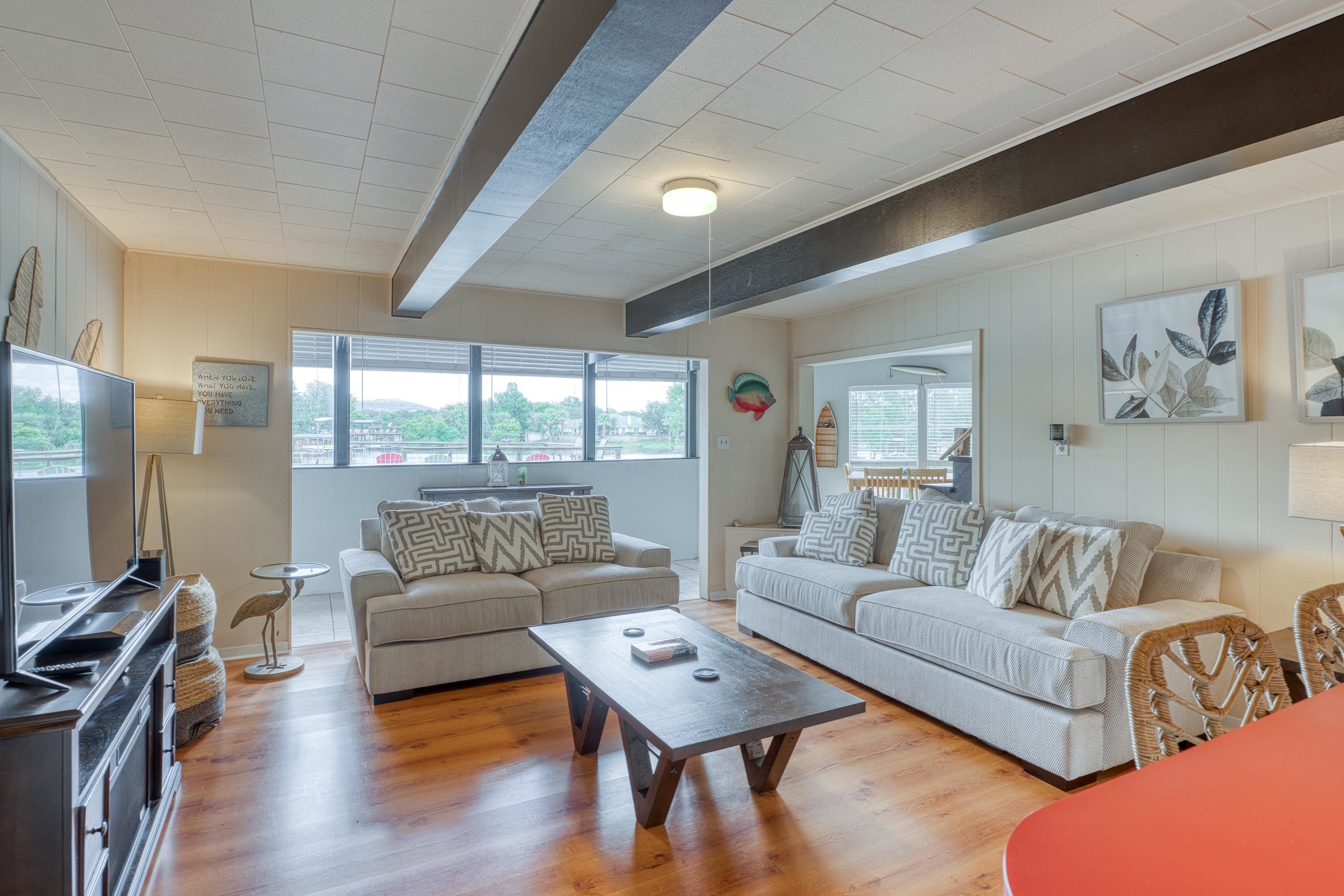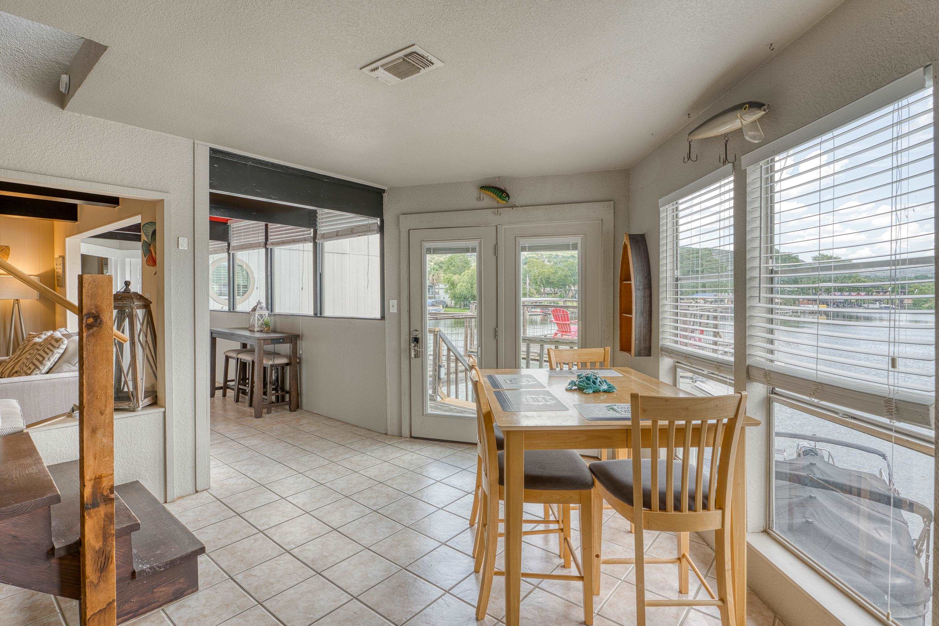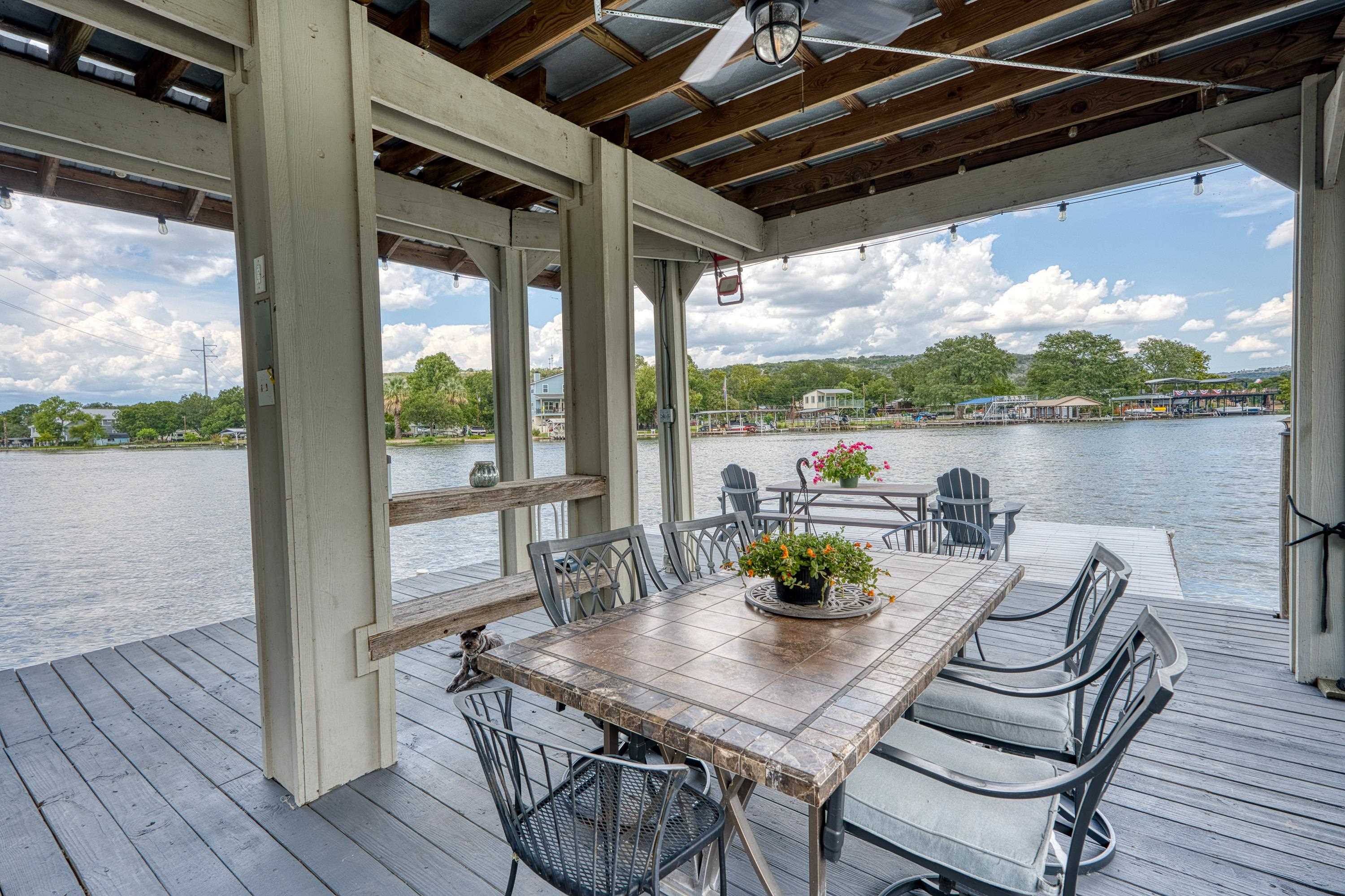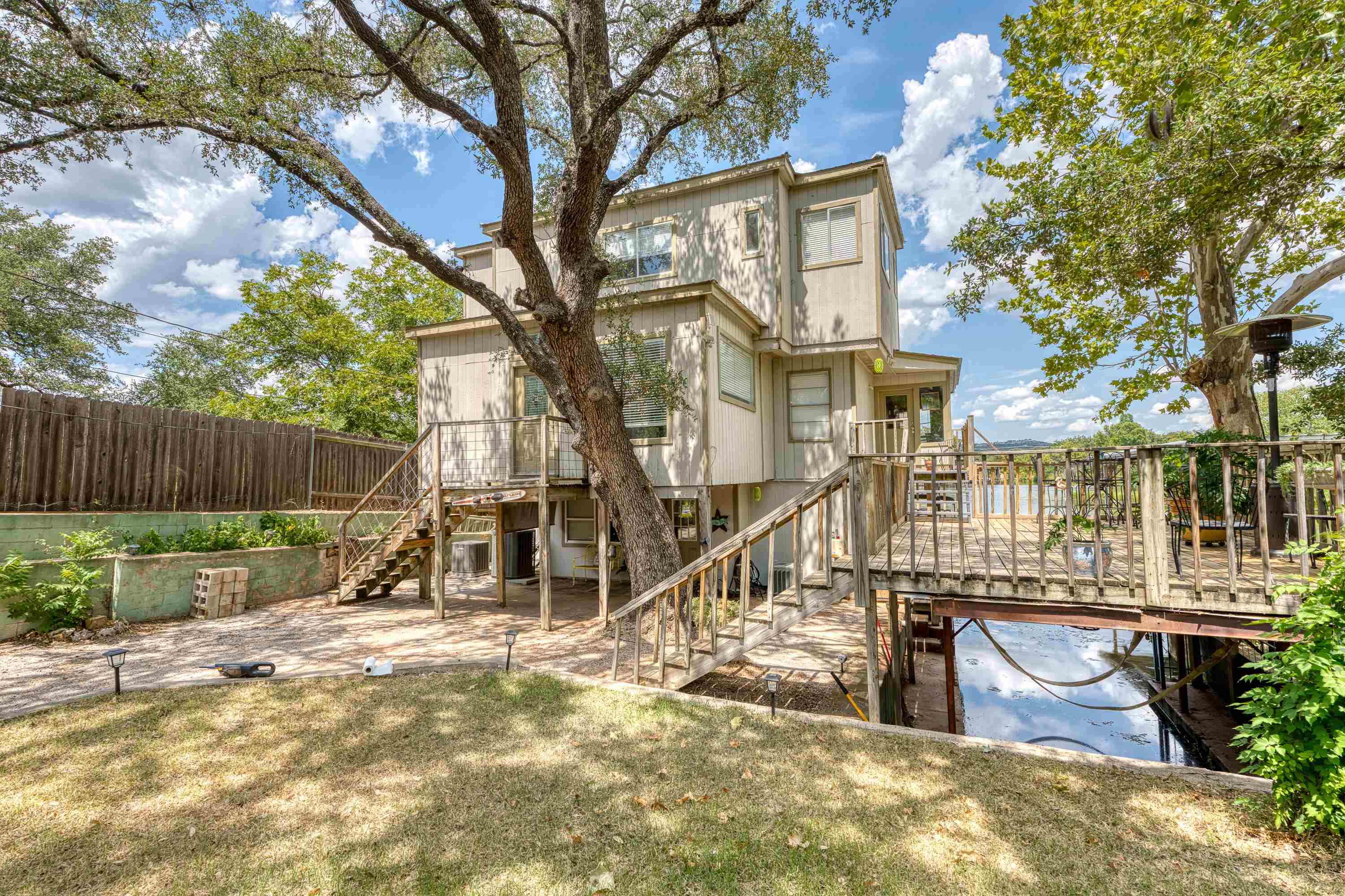 Welcome to this 3-story "tree house" ON the water with 60' of water frontage. TURN-KEY ready for use as a short term rental (STR) or weekend home. This home comes FULLY FURNISHED and is able to sleep 20 people, perfect for large gatherings. This uniquely built home features 5 bedrooms, 3 bathrooms, 2 kitchens, 2 living spaces, and multiple patios. This gated property is near the end of CR 126 and full of beautiful trees creating a private and peaceful park-like setting. The cove has to be one of the best coves on Lake LBJ. Surrounded by clean water, beautiful homes, and Hill Country views for miles. You're able to walk out of the back door and literally jump in the lake! You can't beat the location! 4 miles to Kingsland and 10 miles to Marble Falls, allowing for a quick drive to nearby amenities such as HEB, restaurants, wineries, golfing, hiking, and everything the Hill Country has to offer. Schedule a showing and come enjoy the lake life!