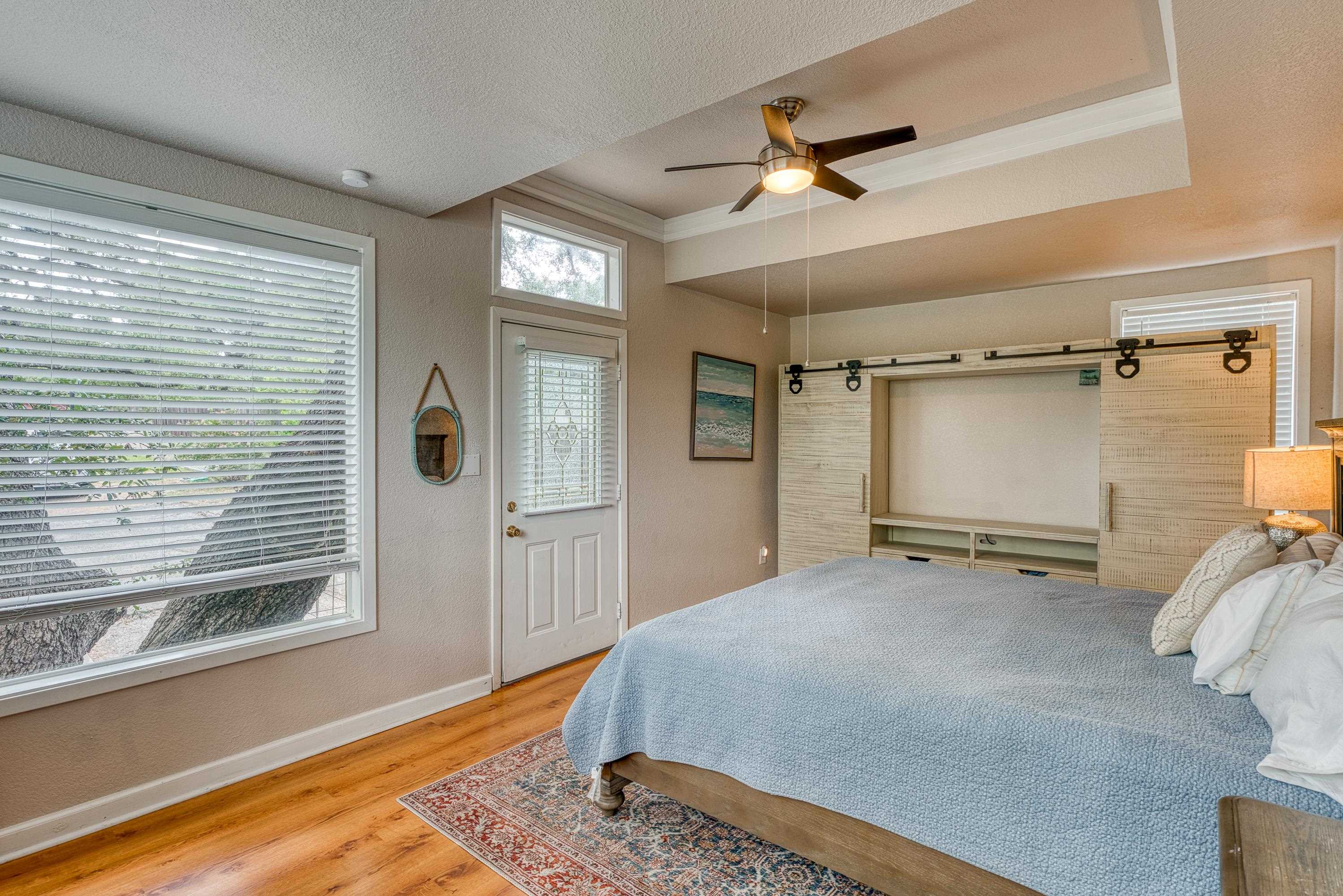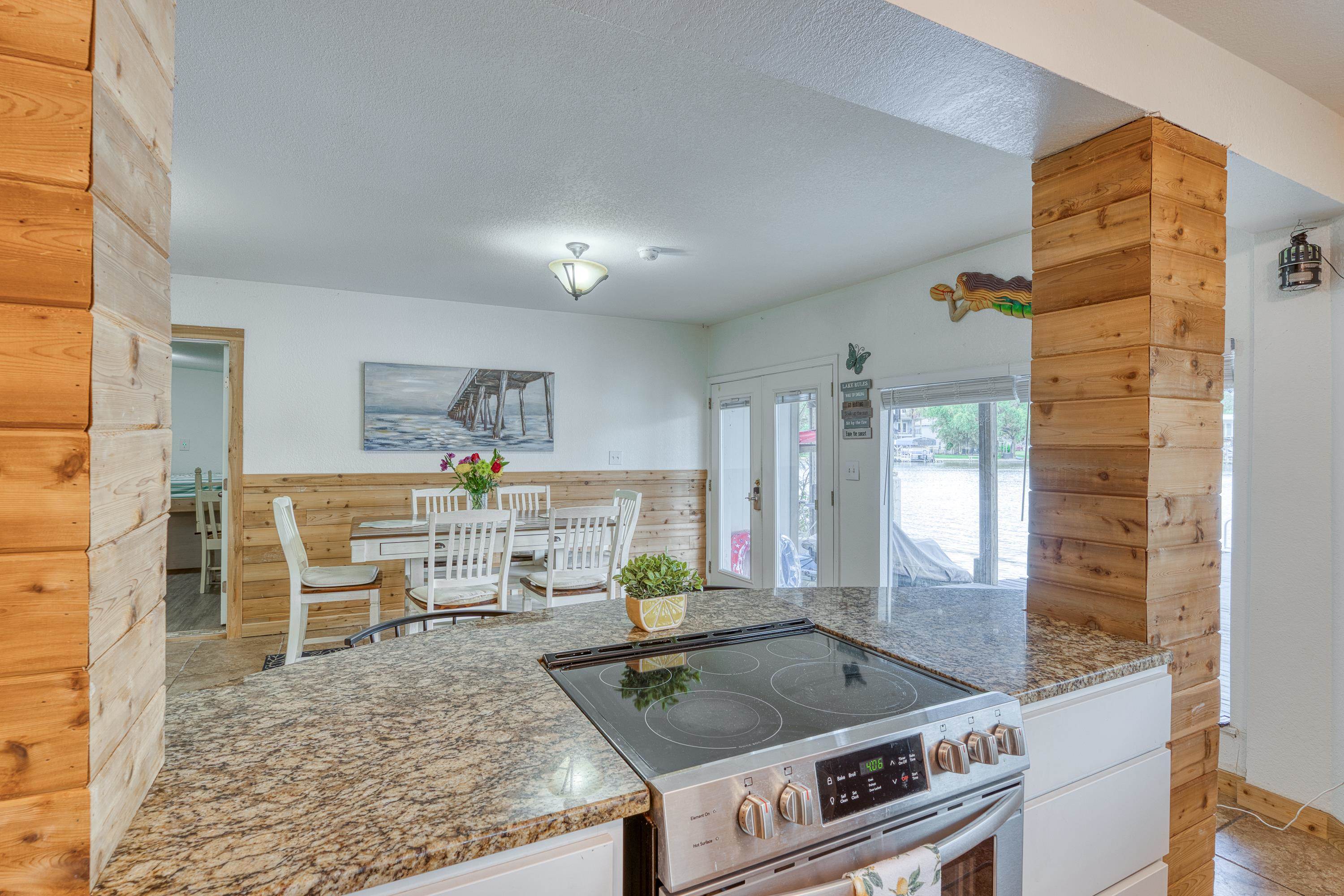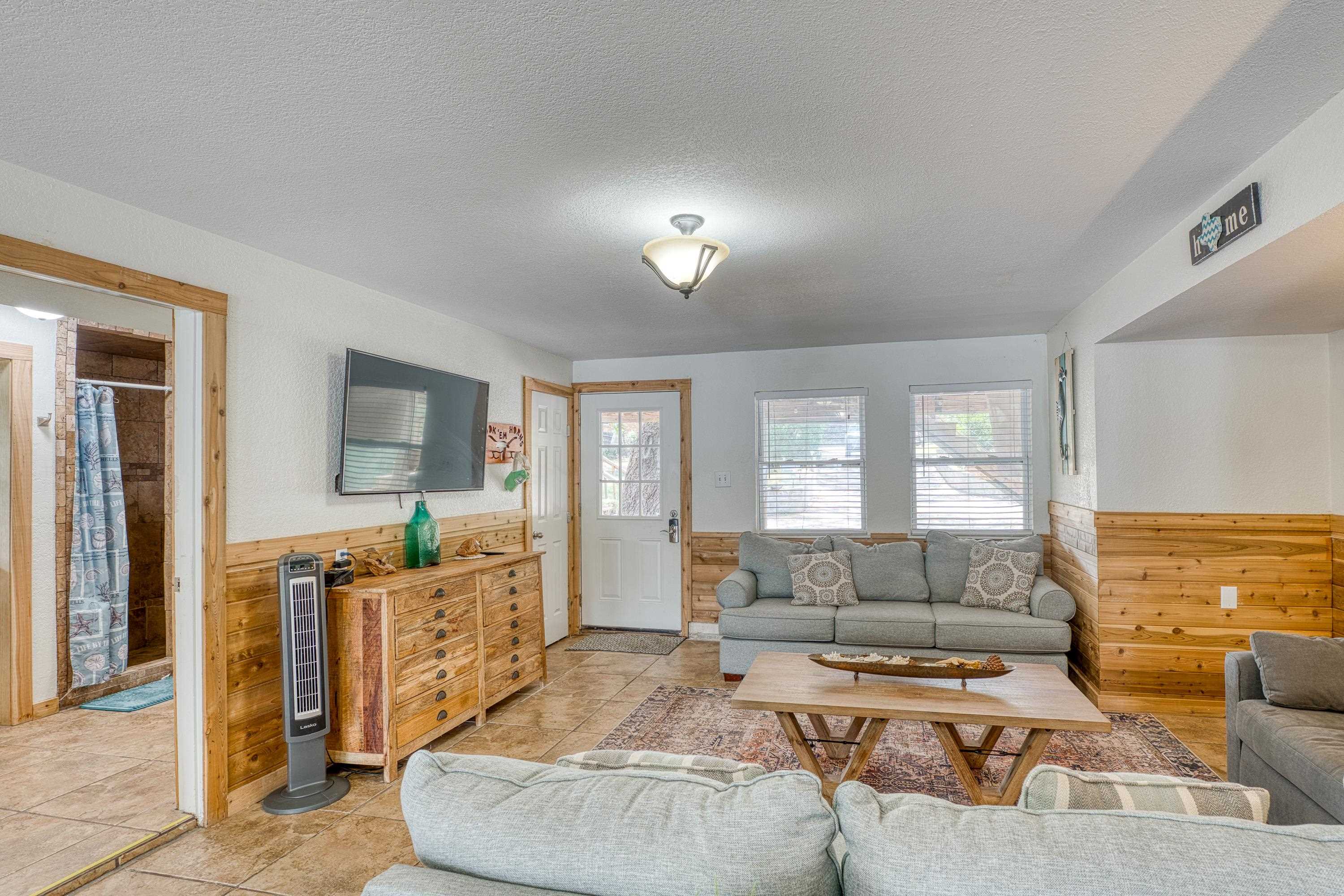 Welcome to this 3-story "tree house" ON the water with 60' of water frontage. TURN-KEY ready for use as a short term rental (STR) or weekend home. This home comes FULLY FURNISHED and is able to sleep 20 people, perfect for large gatherings. This uniquely built home features 5 bedrooms, 3 bathrooms, 2 kitchens, 2 living spaces, and multiple patios. This gated property is near the end of CR 126 and full of beautiful trees creating a private and peaceful park-like setting. The cove has to be one of the best coves on Lake LBJ. Surrounded by clean water, beautiful homes, and Hill Country views for miles. You're able to walk out of the back door and literally jump in the lake! You can't beat the location! 4 miles to Kingsland and 10 miles to Marble Falls, allowing for a quick drive to nearby amenities such as HEB, restaurants, wineries, golfing, hiking, and everything the Hill Country has to offer. Schedule a showing and come enjoy the lake life!