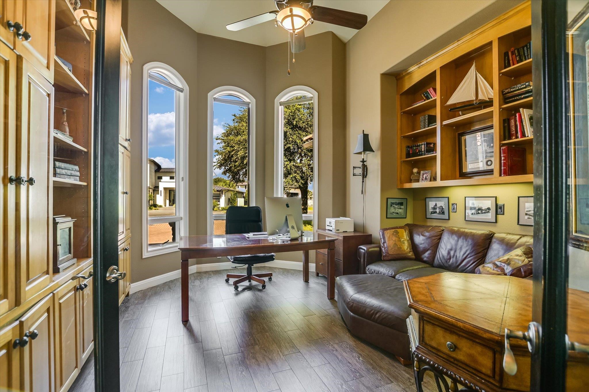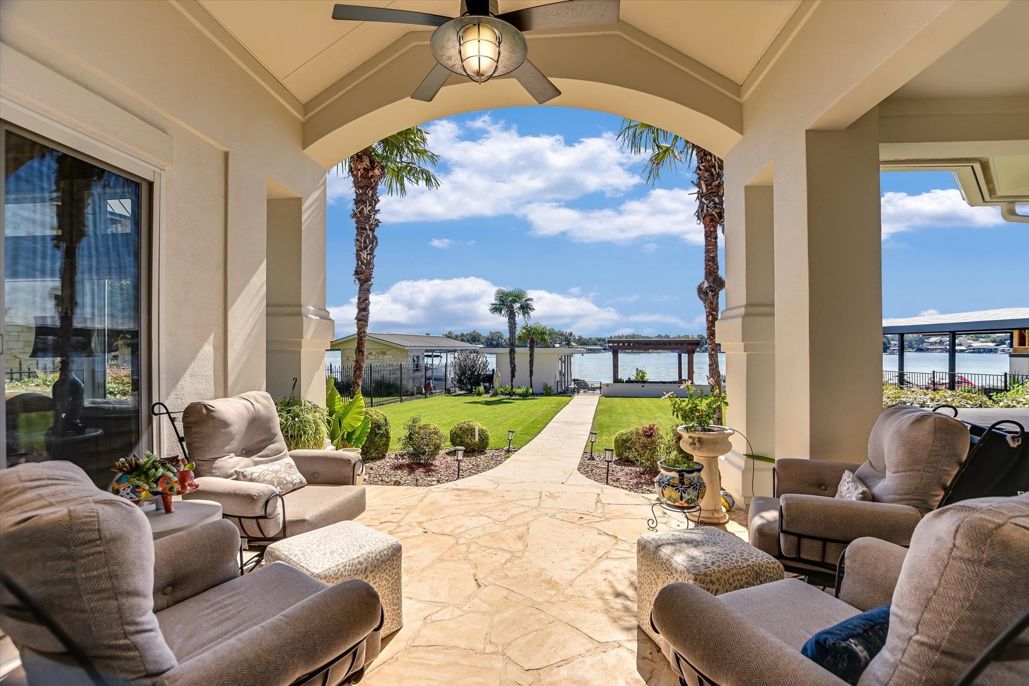 Welcome to 307 Wennmohs Place - a single-level Lake LBJ waterfront retreat. Perfectly positioned on prime open water in Horseshoe Bay West, this stunning residence blends timeless architecture with resort-inspired living. The paver stone drive and soaring columns create an elegant first impression, leading to a grand arched entry that opens into light-filled living spaces. Inside, the great room showcases a stacked-stone fireplace wall, lofty ceilings, and walls of windows that frame the panoramic lake views. The island kitchen features custom cabinetry, granite counters, gas cooktop, Sub-Zero refrigerator, breakfast bar, and an adjacent dining area with panoramic lake views. A dedicated study provides the perfect work-from-home setting, while a cozy sitting area encourages entertaining. The luxurious primary suite offers a cozy sunroom with private patio access, and a spa-inspired bath with dual vanities and generous storage and closet space. Two stylish guest suites ensure comfort for family and friends, both with convenient en-suite baths. Outdoor living takes center stage with a covered patio and lush lawn leading to the expansive lakeside deck, where a pergola-covered seating area, a covered boat lift and one PWC lift create the ultimate setting for relaxation or hosting gatherings on the constant-level waters of Lake LBJ. Impeccably maintained and located just minutes from the Horseshoe Bay Resort, this home delivers the perfect balance of elegance, comfort, and Texas Hill Country waterfront living.