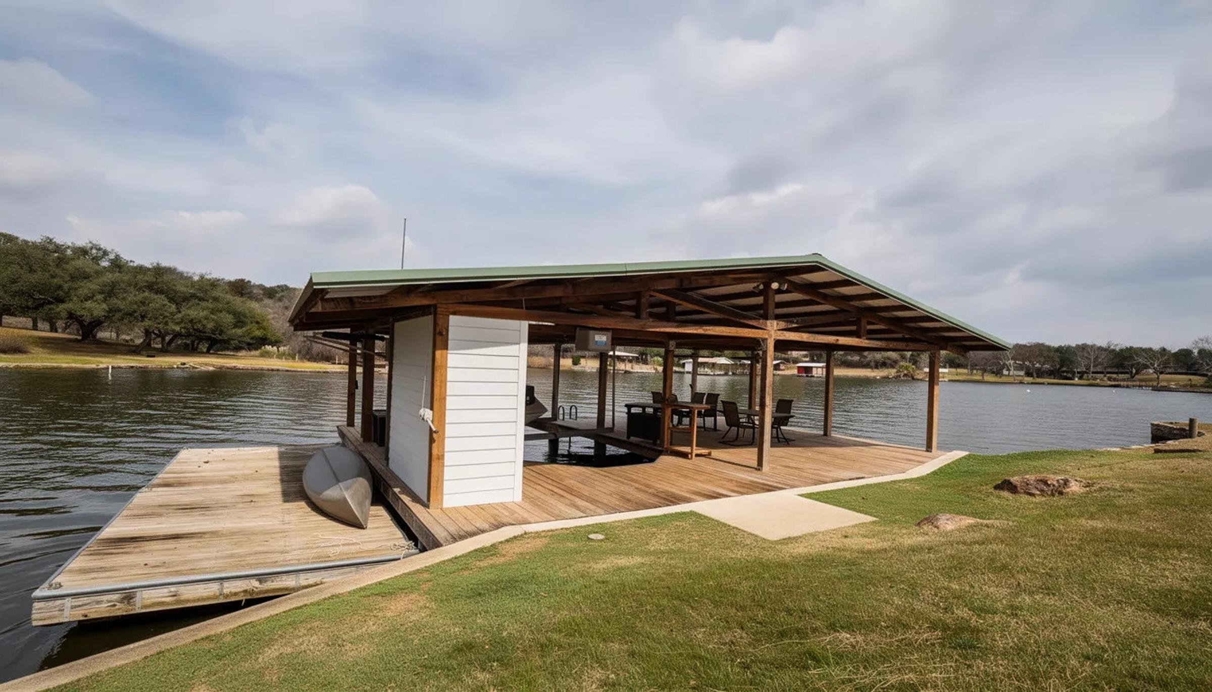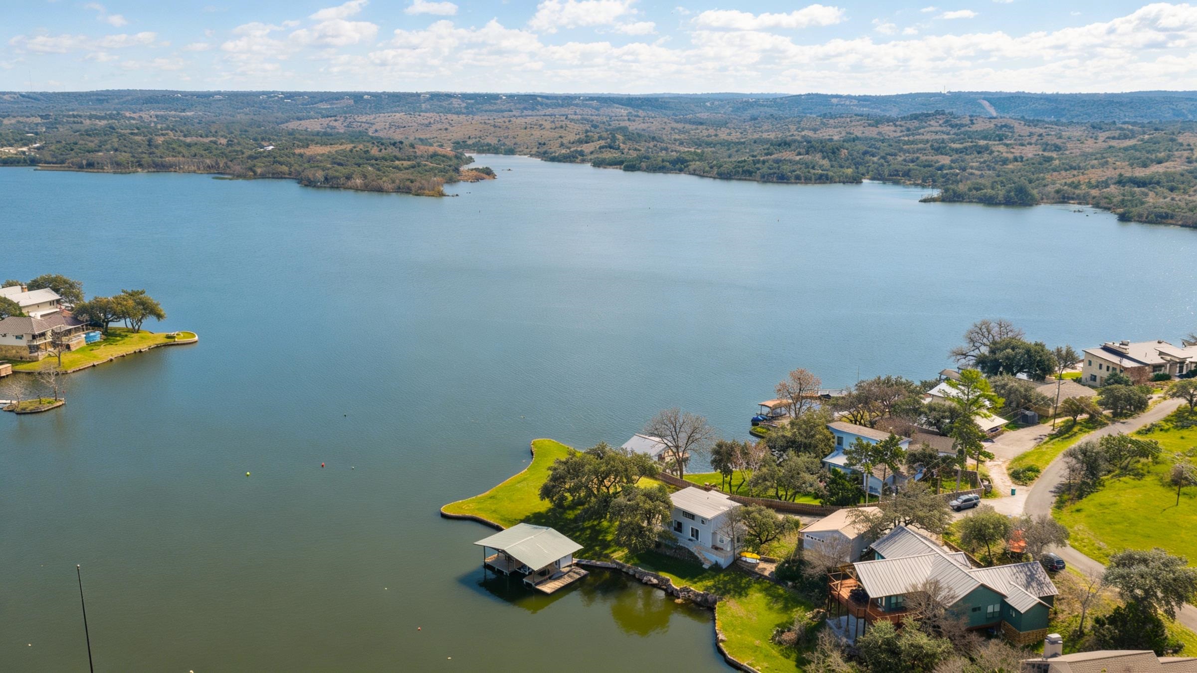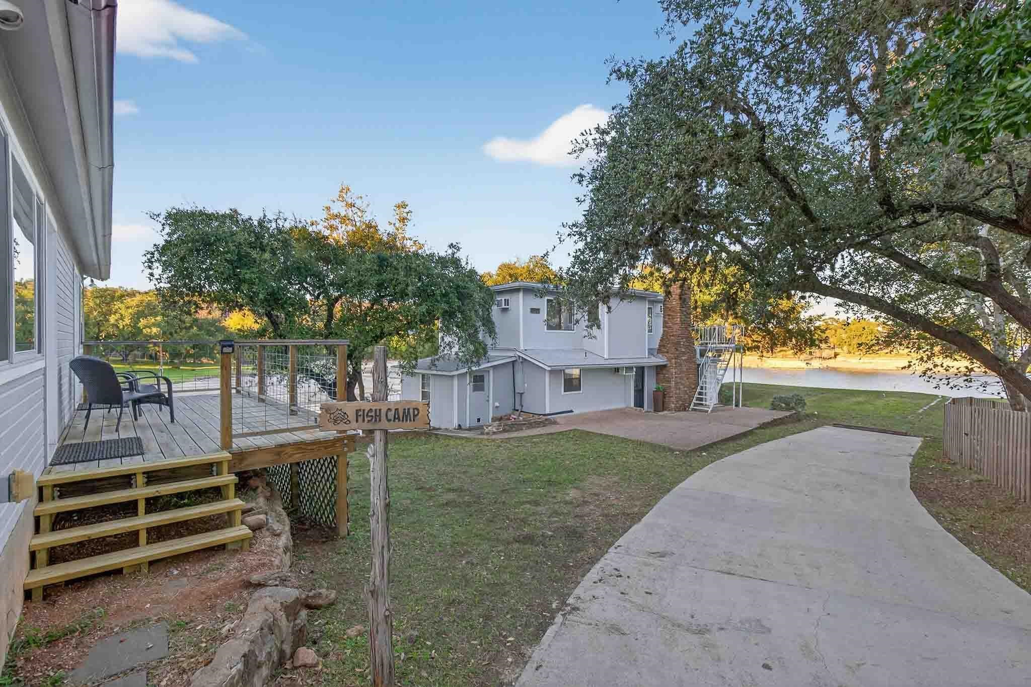 An exceptional opportunity on highly coveted controlled-level Inks Lake, this property offers a rare peninsula setting with nearly 350 feet of waterfront and sweeping east-facing open-water views. The protected cove includes a concrete-pier boat dock, ideal for effortless lake access. This versatile estate can serve as a turnkey retreat—with furnishings negotiable—or as a prime redevelopment site for a custom lakefront masterpiece. The main residence offers 1,567 sq ft of living space, plus an additional 410 sq ft casita, located within the gated community of Inks Lake Village, the property benefits from a short-term-rental-friendly environment, making it equally attractive for personal use or investment. The current layout includes a 2-bed, 2-bath casita alongside a 2-bed, 2-bath main residence, offering privacy and flexibility for hosting family or guests. The property is also scheduled to receive a LCRA-approved five-bedroom septic system, expanding future development potential. For added confidence, the home has been pre-inspected, ensuring peace of mind for prospective buyers.