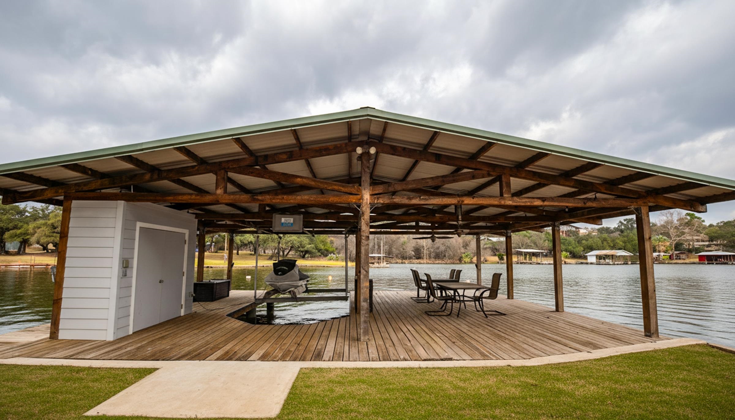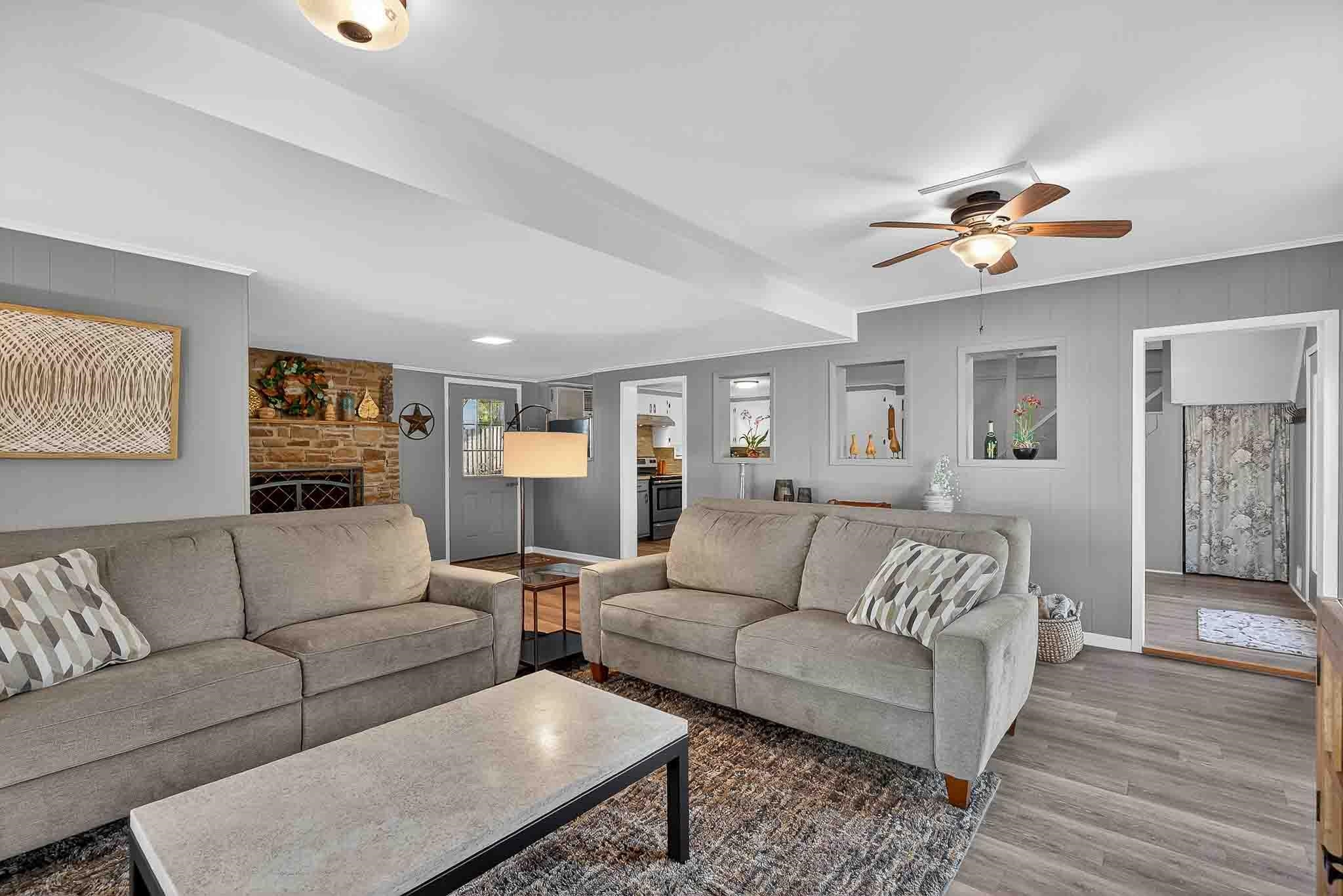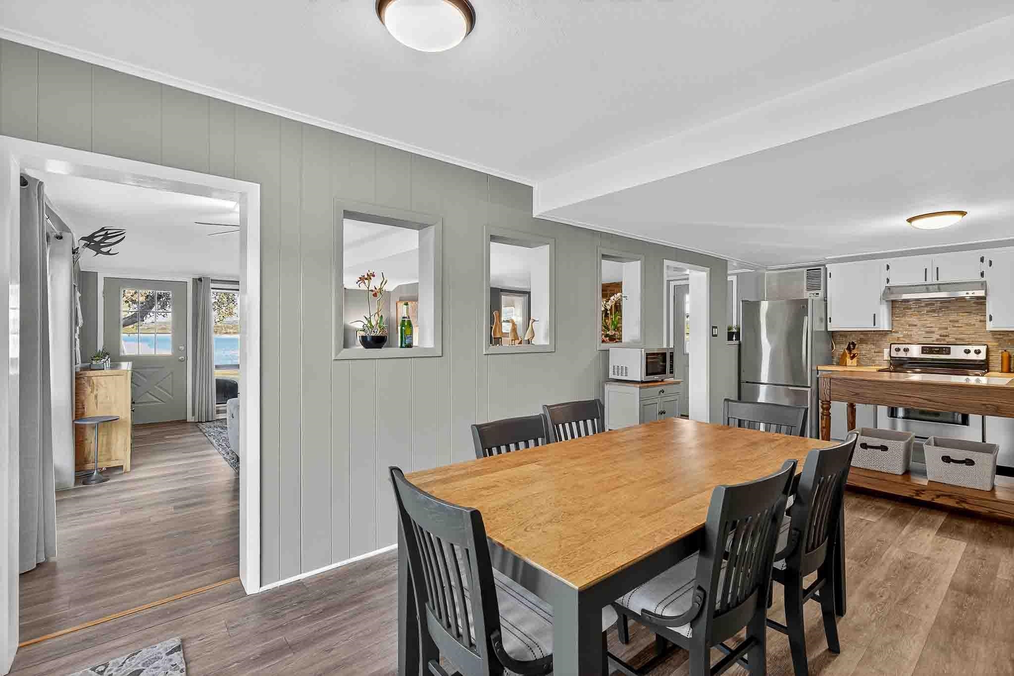 An exceptional opportunity on highly coveted controlled-level Inks Lake, this property offers a rare peninsula setting with nearly 350 feet of waterfront and sweeping east-facing open-water views. The protected cove includes a concrete-pier boat dock, ideal for effortless lake access. This versatile estate can serve as a turnkey retreat—with furnishings negotiable—or as a prime redevelopment site for a custom lakefront masterpiece. The main residence offers 1,567 sq ft of living space, plus an additional 410 sq ft casita, located within the gated community of Inks Lake Village, the property benefits from a short-term-rental-friendly environment, making it equally attractive for personal use or investment. The current layout includes a 2-bed, 2-bath casita alongside a 2-bed, 2-bath main residence, offering privacy and flexibility for hosting family or guests. The property is also scheduled to receive a LCRA-approved five-bedroom septic system, expanding future development potential. For added confidence, the home has been pre-inspected, ensuring peace of mind for prospective buyers.