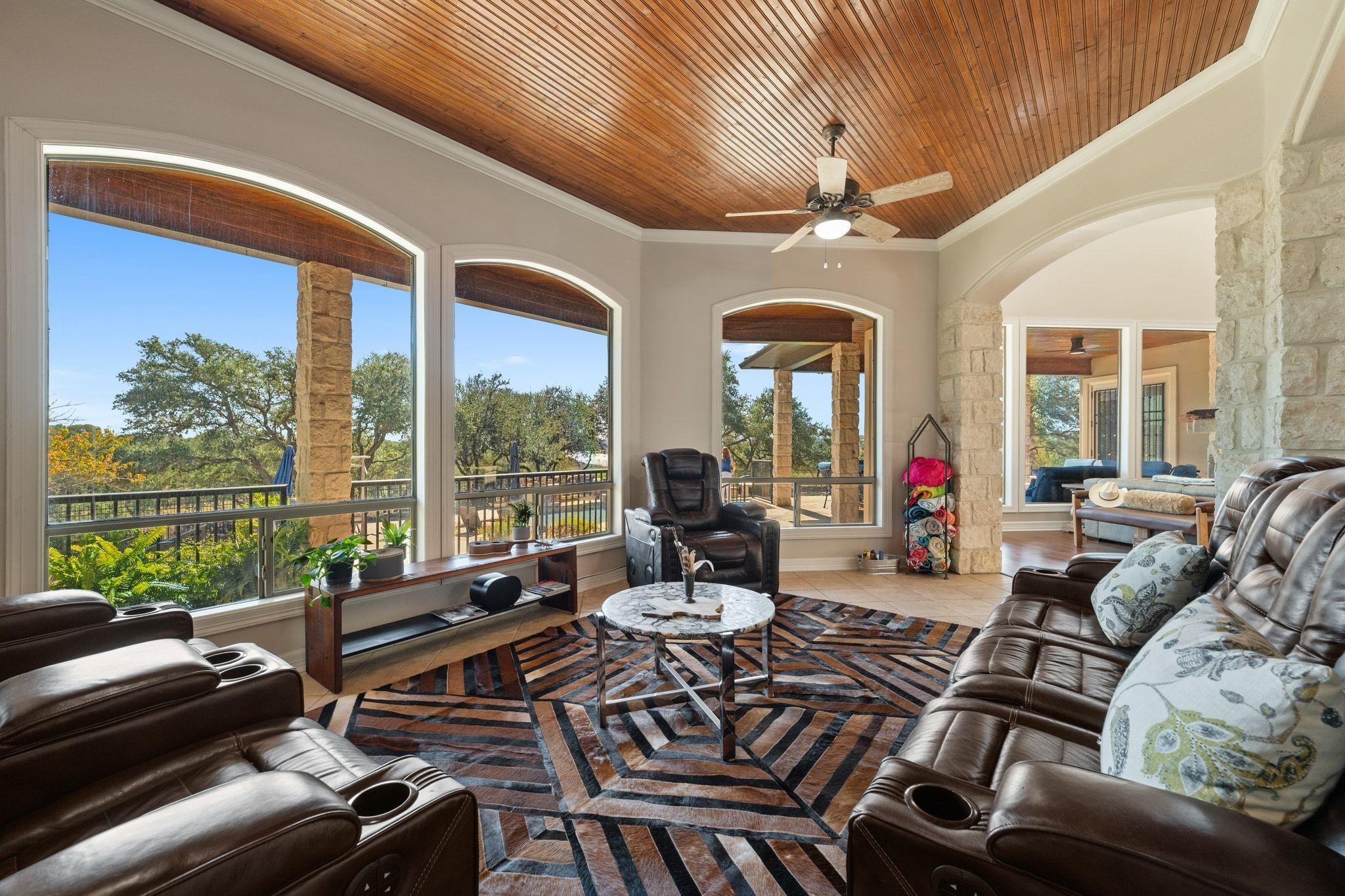 Welcome to 185 Shimmering Shore Court, where Canyon Lake living meets “yes, everyone can come over — and no, you still don’t have to see them if you don't want to.” Set on over 5.6 wildlife-filled acres and over 200' of lake frontage, this private estate offers room to spread out, unwind, and coexist peacefully with both nature and friends & family. Inside, you’ll find 5 bedrooms and 5 bathrooms across 5,307 square feet — thoughtfully designed so everyone has space to relax (or retreat, depending on the day). The home has been meticulously maintained and recently upgraded with a brand-new water softener, because luxury is in the details. Pour a glass in your screened-in wine room, unwind in any of the four living areas, or indulge in your personal steam shower. Step outside to more than 1,700 square feet of patio space overlooking a sparkling pool with waterfall, fire features, jacuzzi, and a putting course ideal for golfers and enthusiastic “just-for-fun” putters alike. Meanwhile, deer and other local wildlife wander by as if they pay rent. Guests staying over? The detached guest suite lets them enjoy comfort and privacy — and allows you to maintain yours. A 3-car garage offers room for lake toys, adventure gear, or simply the things you swear you’ll use someday. Located less than an hour from both Austin and San Antonio, the home offers peaceful seclusion without sacrificing convenience. Brand-new appliances included — and the home can even be offered furnished with the right terms. So bring your frien
