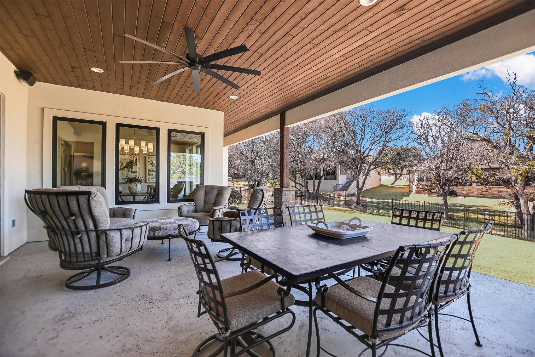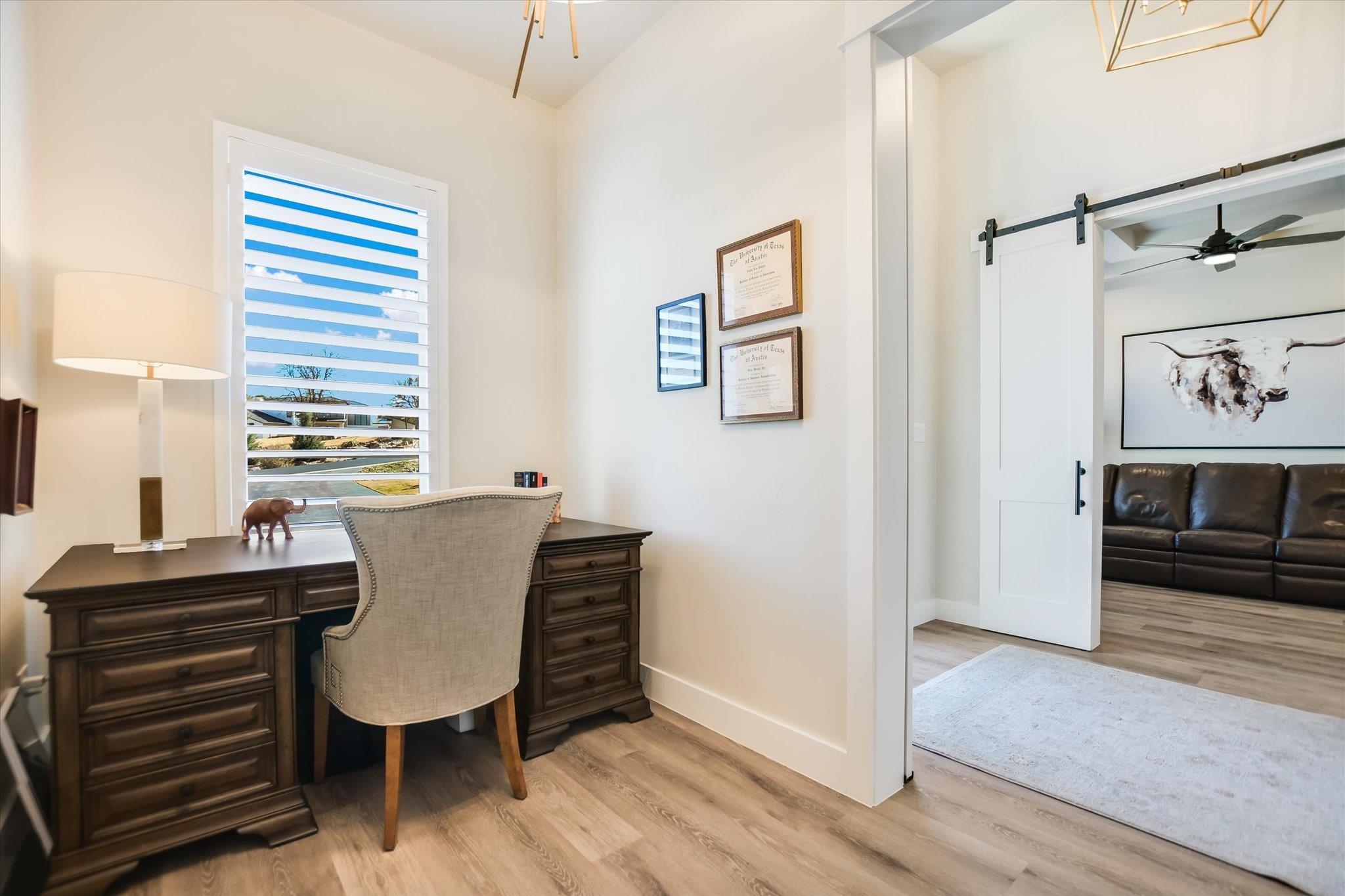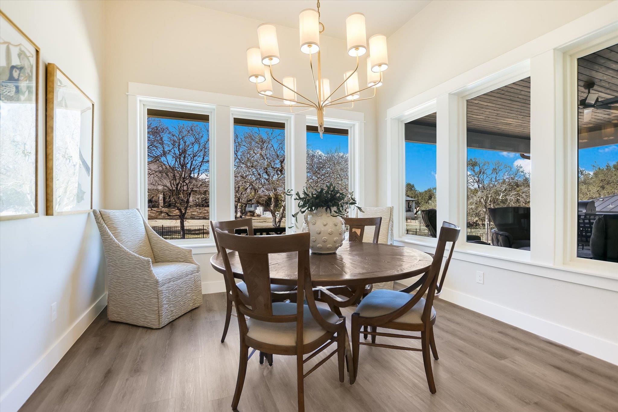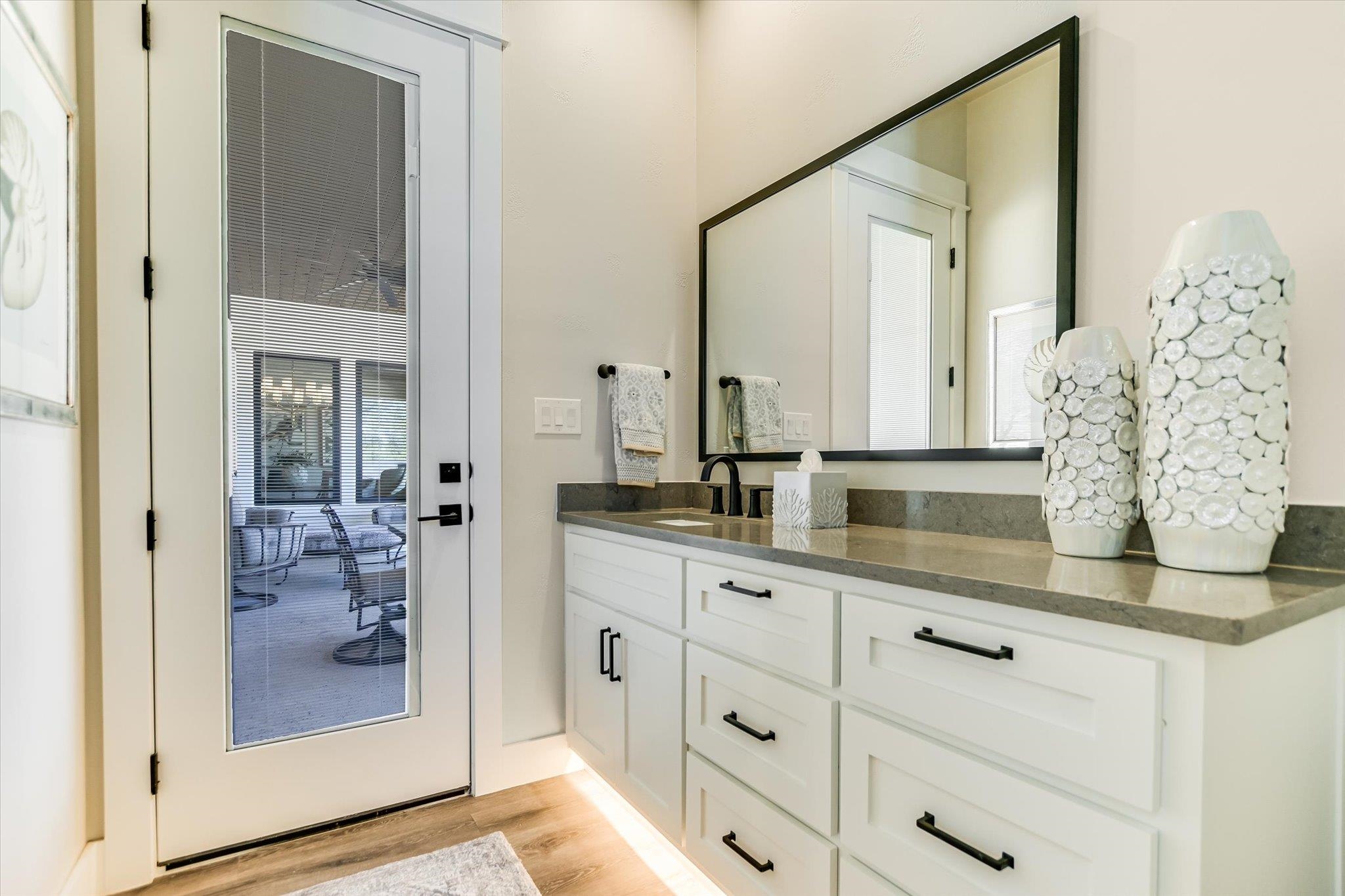 Gently lived in and built in 2022, this beautifully crafted home offers the perfect blend of modern luxury and flexible living spaces. From the moment you enter, you’re welcomed by a spacious backyard framed by gorgeous mature trees — creating a peaceful setting that feels like home. Inside, the light and bright open-concept floor plan is designed for both everyday comfort and effortless entertaining. Two versatile flex rooms provide endless possibilities — ideal for home offices, craft rooms, workout spaces, or playrooms. Each bedroom features its own dedicated vanity, offering convenience and privacy, plus an additional half bath perfectly positioned to serve as a future pool bath. The chef’s kitchen is a true showpiece, featuring premium Wolf double ovens and Sub-Zero appliances, oversized pendant lighting above a generous breakfast bar, and a seamless flow into the main living space. A striking stone wall fireplace anchors the living room, creating warmth and character. The primary suite is a luxurious retreat, complete with vaulted ceilings accented by custom beams and separate his-and-hers closets. Additional high-end features include: Plantation shutters, Oversized quartz slab at breakfast bar, Tankless water heater, Water softener and filtration system, Epoxy-finished three-car garage, Tongue-and-groove ceiling treatment on the patio and entry, Outdoor gas grill — perfect for entertaining. While located in Applehead West, this gives you access to a pool, tennis courts, and grilling area
