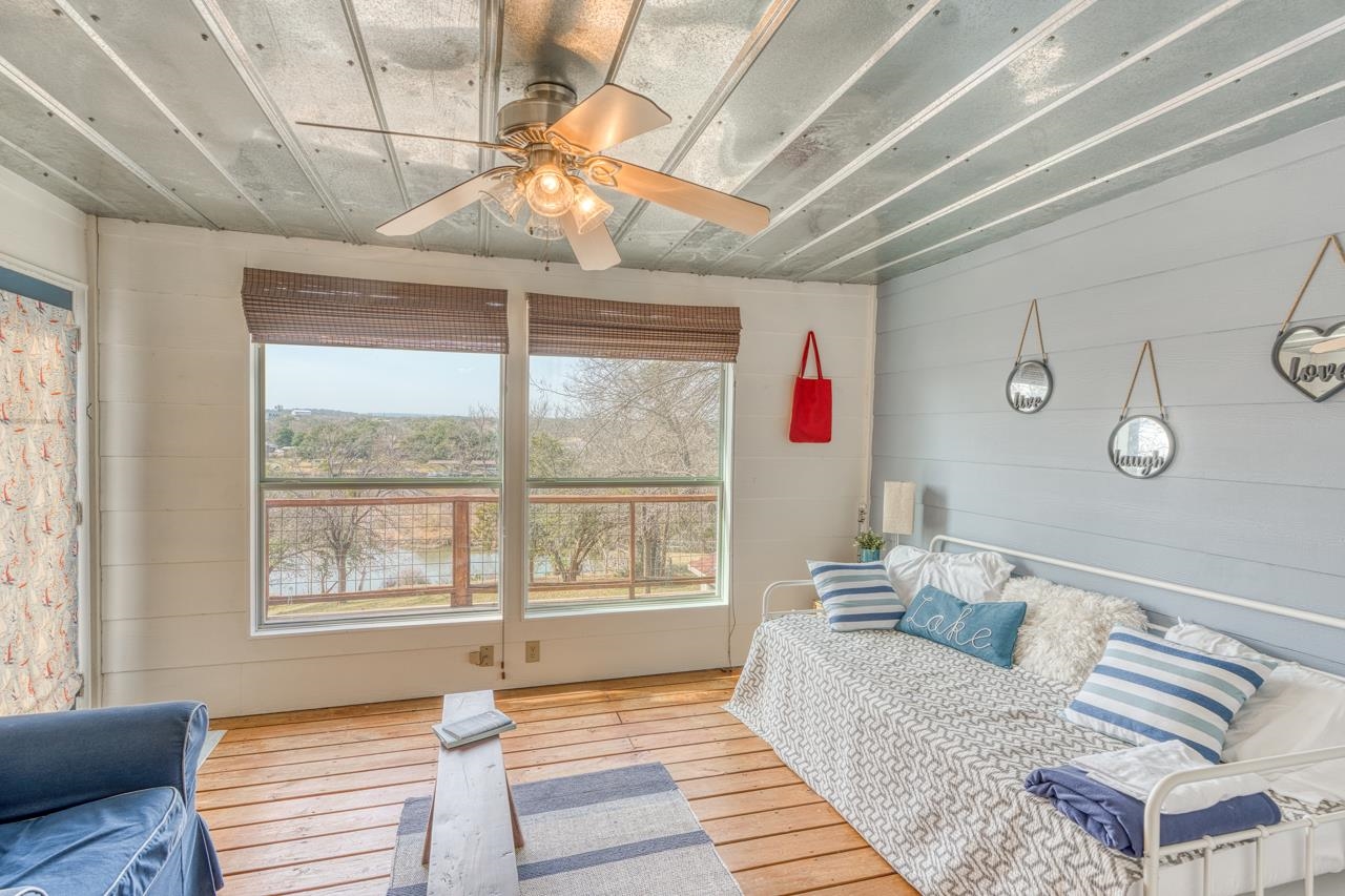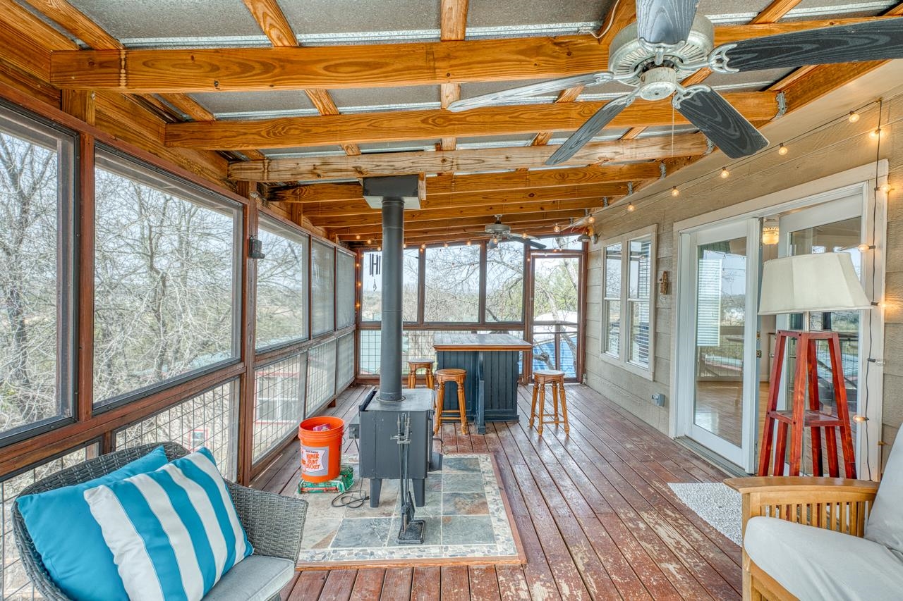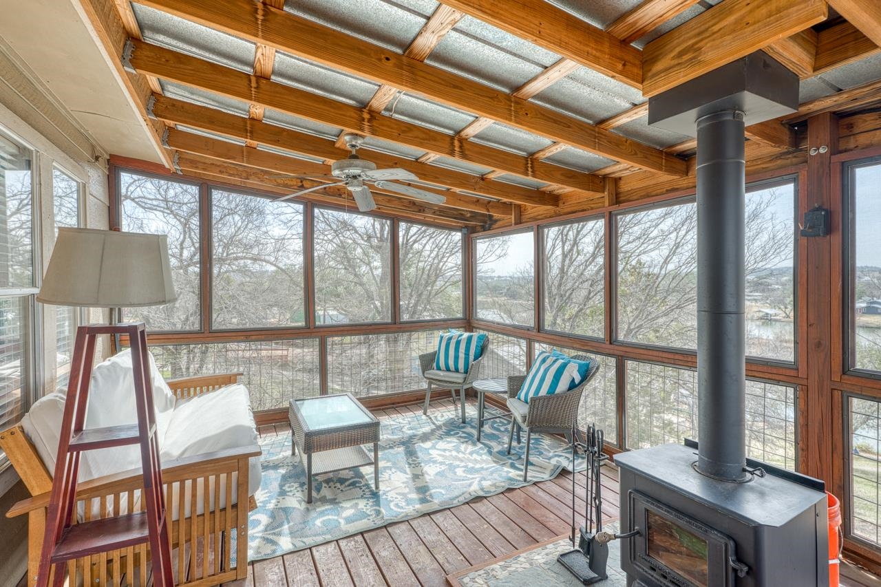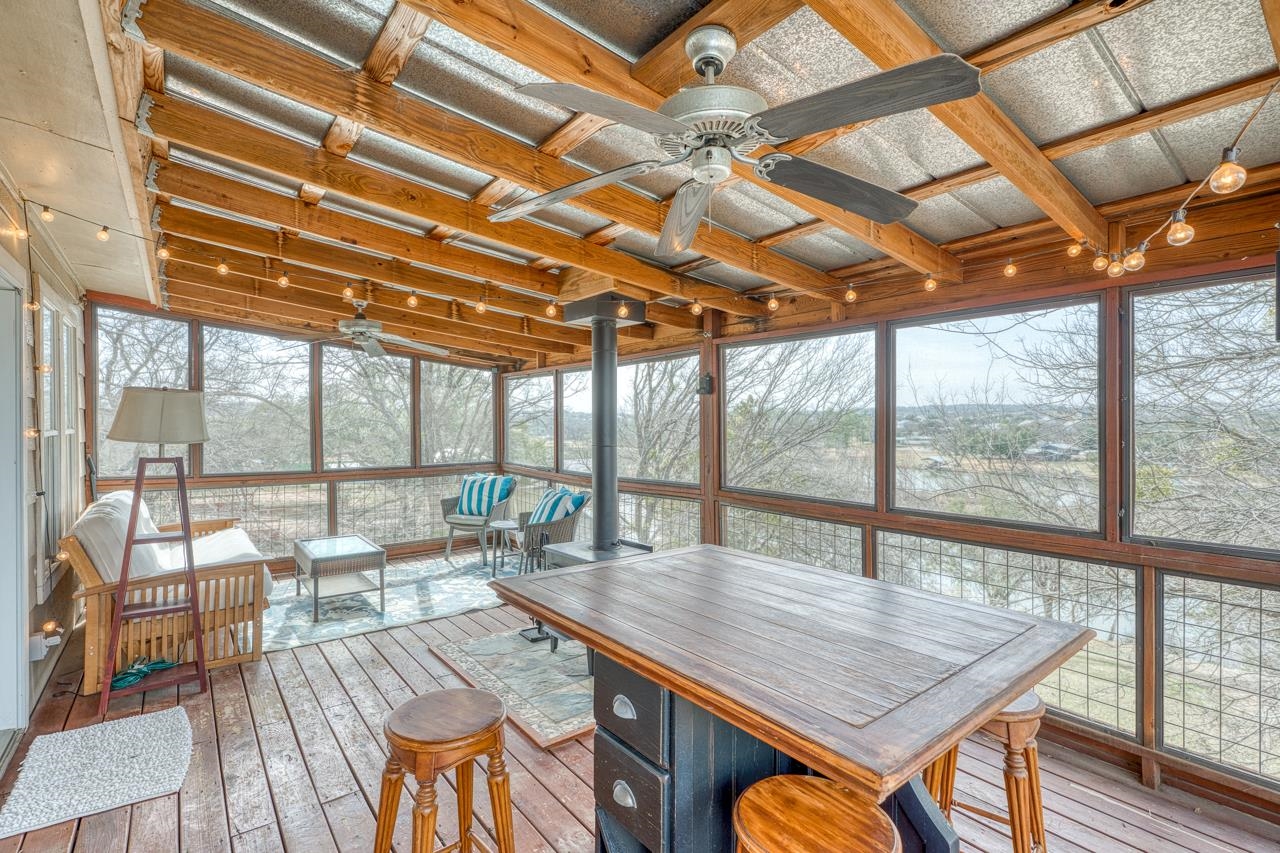 Lake LBJ cute and cozy lakeside cottage located in Sunrise Beach in the beautiful Texas Hill Country. This 2 bedroom, 2 bath home sites on two lots consisting of 100 feet of prized LBJ waterfront and .58 acres. The home is situated well above the 100 year floodplain resulting in lower insurance costs. The upper level features open living with a kitchen with a breakfast bar, dining area and the living area all with water and extensive Hill Country views. Just outside the living area is a large screened in porch with a wood burning stove, lots of room for a large outside dining area and plenty of sitting area to enjoy the views. There are two bedrooms downstairs and 2 cutely decorated baths with pedestal sinks. There is a tranquil day room off one of the bedrooms and a laundry and storage area off the other bedroom. The lakeside is a great place to swim, kayak. paddleboard and fish. There are 2 PWC ramps at the water`s edge when you want to venture farther and faster. There is also a detached carport with a storage room and a storage building in the lakeside yard. Sunrise Beach is an incorporated City with sensible zoning, police department and combination ESD and volunteer fire department. There are also 5 City parks and three of them have boat ramps. Furnishings, boat and PWCs are negotiable and offer the opportunity to enjoy lake life immediately.