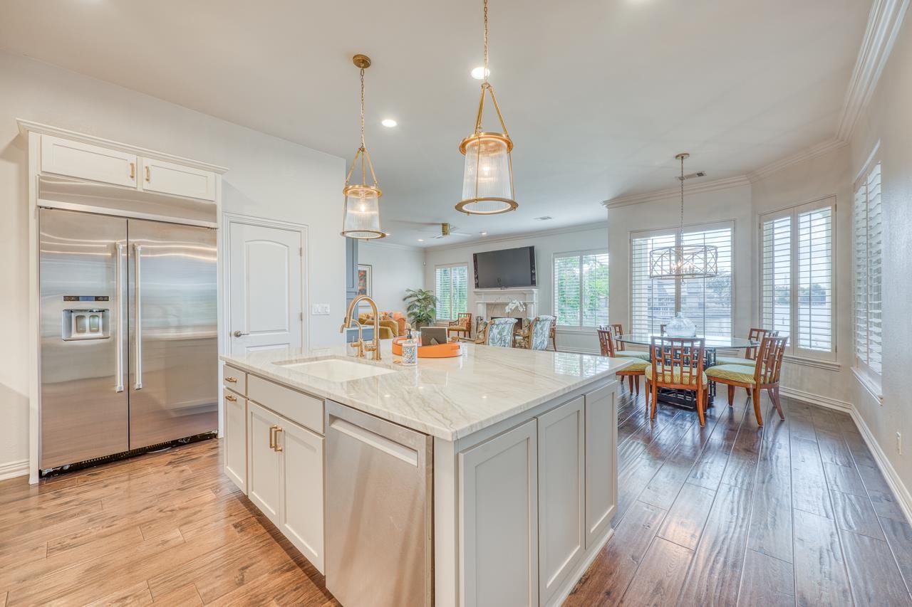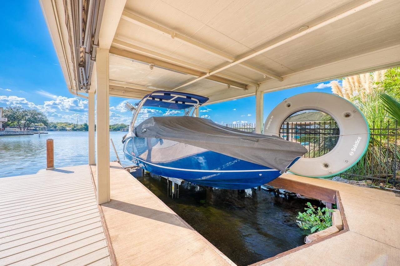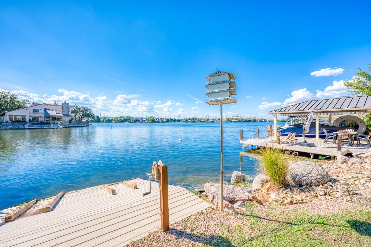 Discover the perfect blend of luxury and comfort in this stunning 5-bedroom, 3-bath (5th bedroom is bunk room multi-purpose room) waterfront home on Lake LBJ, nestled in the heart of the prestigious Horseshoe Bay Resort on the sought after street Red Sails. This rare core area, single level, water front residence boasts a newly remodeled kitchen featuring top-of-the-line Jenn-Air stainless steel appliances, including a 6-burner gas stove, double-door built-in refrigerator,ice maker and a built-in wine refrigerator, perfect for culinary enthusiasts. The spacious split bedroom layout includes a bonus room, expansive living areas, and a generous main suite with a bright ensuite, all designed for relaxation and entertaining. Step outside to a large covered patio overlooking breathtaking water views, a private boathouse with electric lift, extra storage closet for all your boat equipment and toys and a beautiful backyard ideal for gatherings or leisurely afternoons by the water. Enjoy your large water front dock perfect for lounging or cocktail hours lakeside, this home is your gateway to endless fun on Lake LBJ. With an oversized two-car garage and ample parking for guests, this home is your gateway to creating lifelong memories in a prime waterfront location, just a short golf cart ride to resort amenities. Don’t miss this rare opportunity to own a prime open water front home close to resort amenities.