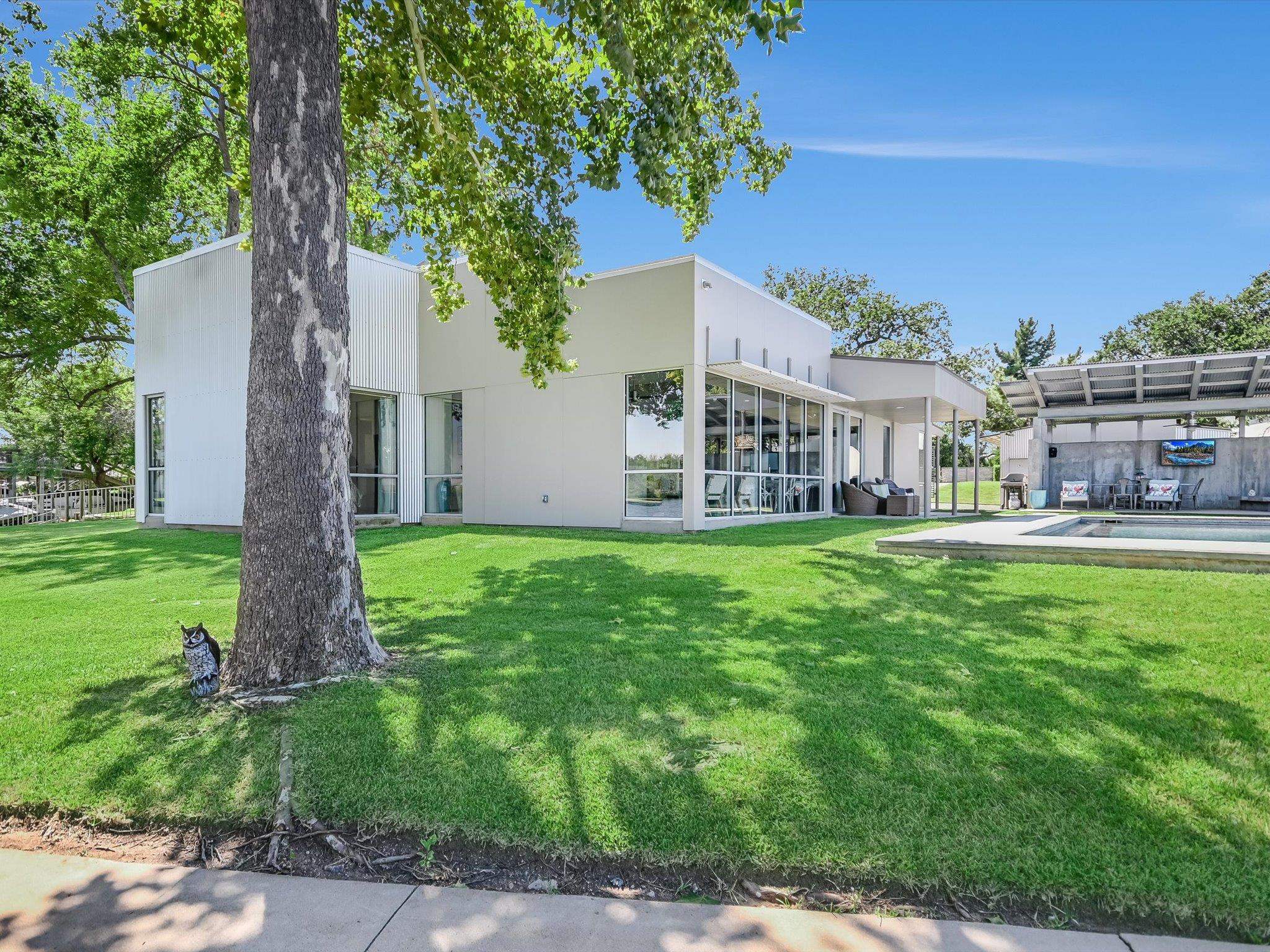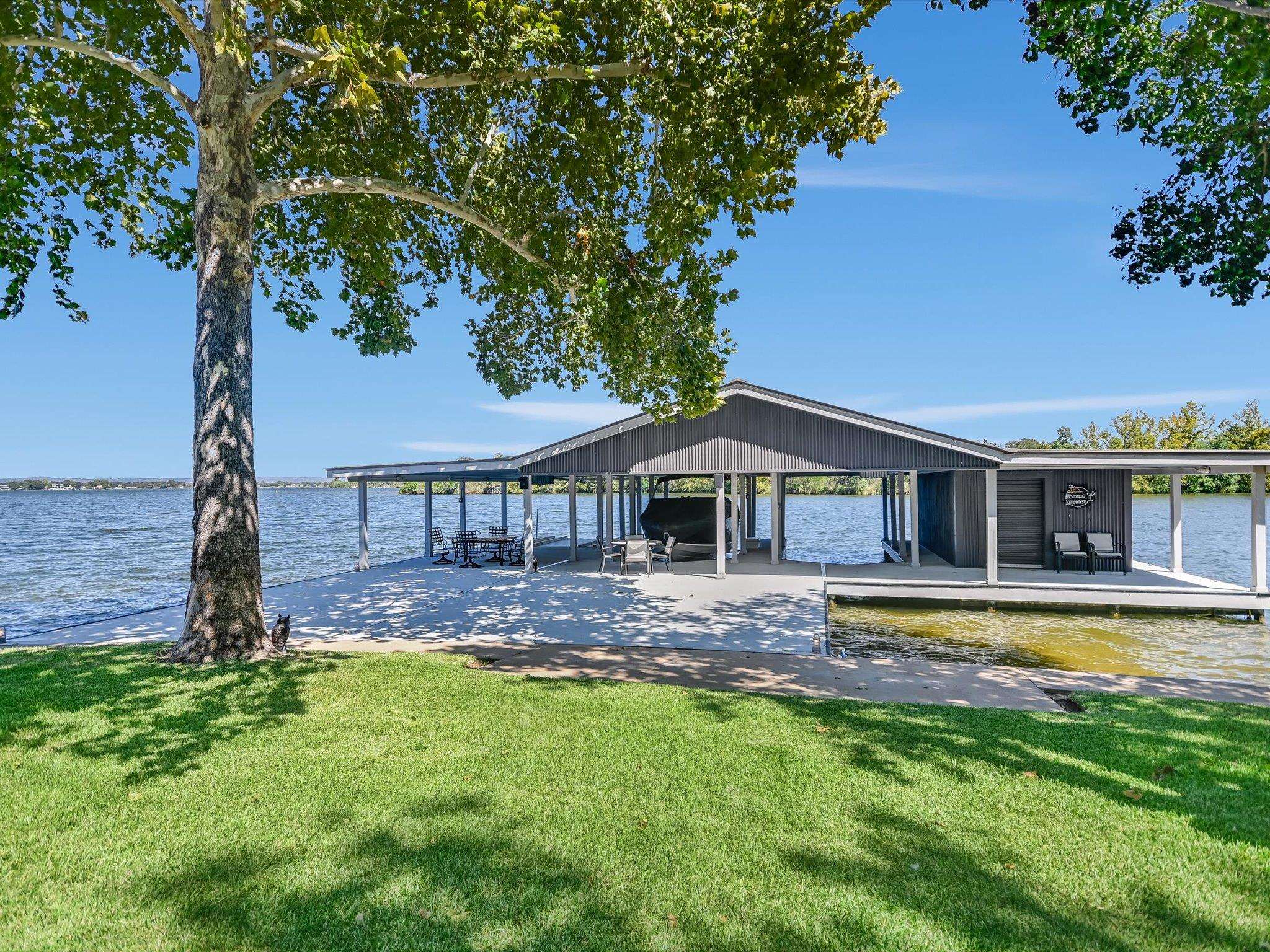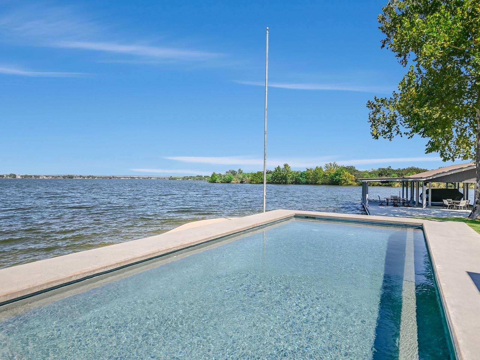 Welcome to 317 Scenic Dr., an exceptional waterfront property offering 287' of constant-level Lake LBJ shoreline in Oak Ridge Estates. Set on two expansive lots totaling 0.71 acres, the property is framed by mature trees and a gently curving shoreline. The dual-lot configuration enhances property value and provides space for future expansion or additional structures. Vacant land across the cove is LCRA-owned, preserving the peaceful setting and views from the property. A private drive introduces the residence, where clean architectural lines and walls of glass frame uninterrupted lake views. The main living spaces are filled with natural light and anchored by new luxury vinyl plank flooring. The main house features two spacious ensuite bedrooms and 2.5 baths, along with open kitchen, dining, and living areas designed for relaxed lakefront living. A detached bunkhouse offers two additional bedrooms with a Jack & Jill bath, comfortably accommodating up to eight guests. Outdoor living defines the experience. A lakeside pool sits just steps from the shoreline, while patios and shaded seating areas create inviting spaces for lounging. The expansive boat dock features two covered boat slips with lifts, two PWC lifts, a spacious lounging deck, and storage room, functioning like a private waterfront pavilion with effortless access to Lake LBJ open water. 317 Scenic Dr. presents a rare opportunity to create an extraordinary waterfront retreat on a homesite defined by privacy, Hill Country and open-water views.