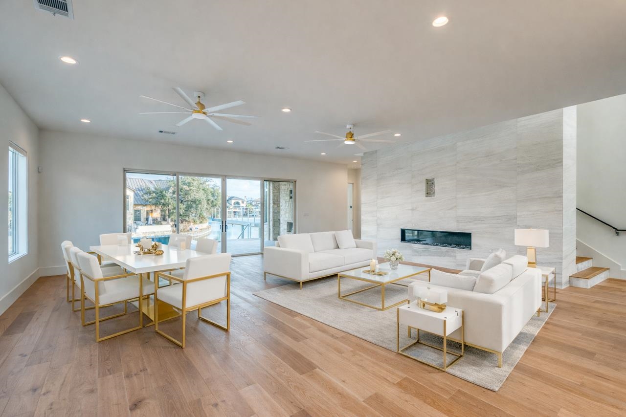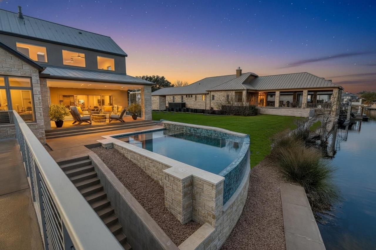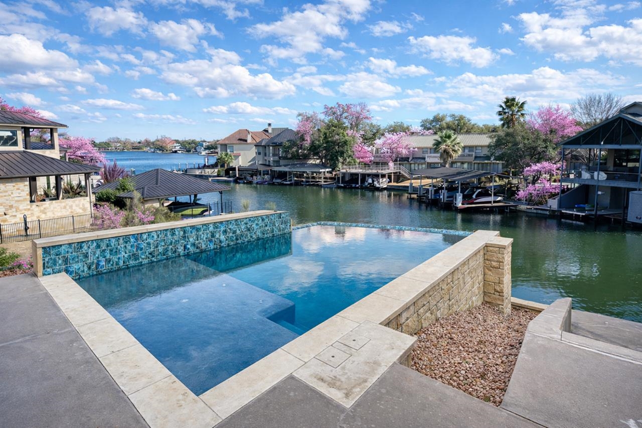 Waterfront home to be built by Neiman Foster Custom Homes in prestigious Horseshoe Bay West on a quiet cove with open-water views of Lake LBJ. This 4BR/4.5BA contemporary residence offers approximately two levels of thoughtfully designed living with panoramic lake views, private boathouse, jet ski parking, pool, and expansive sun deck. Open-concept great room features soaring ceilings, marble fireplace, floating second-story design, and walls of glass framing the water. Chef’s kitchen includes quartz countertops, two-tone cabinetry, Thermador appliance suite, wine cooler, butler’s pantry, and mudroom. Main-level lakeview primary suite offers spa-style bath with wet room and soaking tub, plus a private guest suite. Upstairs includes a second living area with wet bar, bunk room, two additional bedrooms, and two baths (one en-suite). Covered patio with outdoor kitchen and fireplace overlooks the pool and lake. Oversized 3-car garage. Buyer may customize this plan or design a custom home (pricing subject to change). Blueprint available; similar home available for tour.