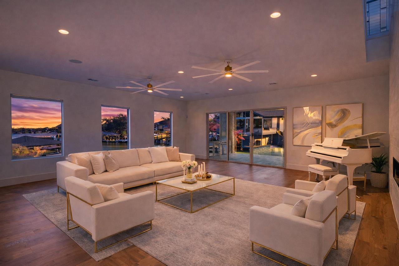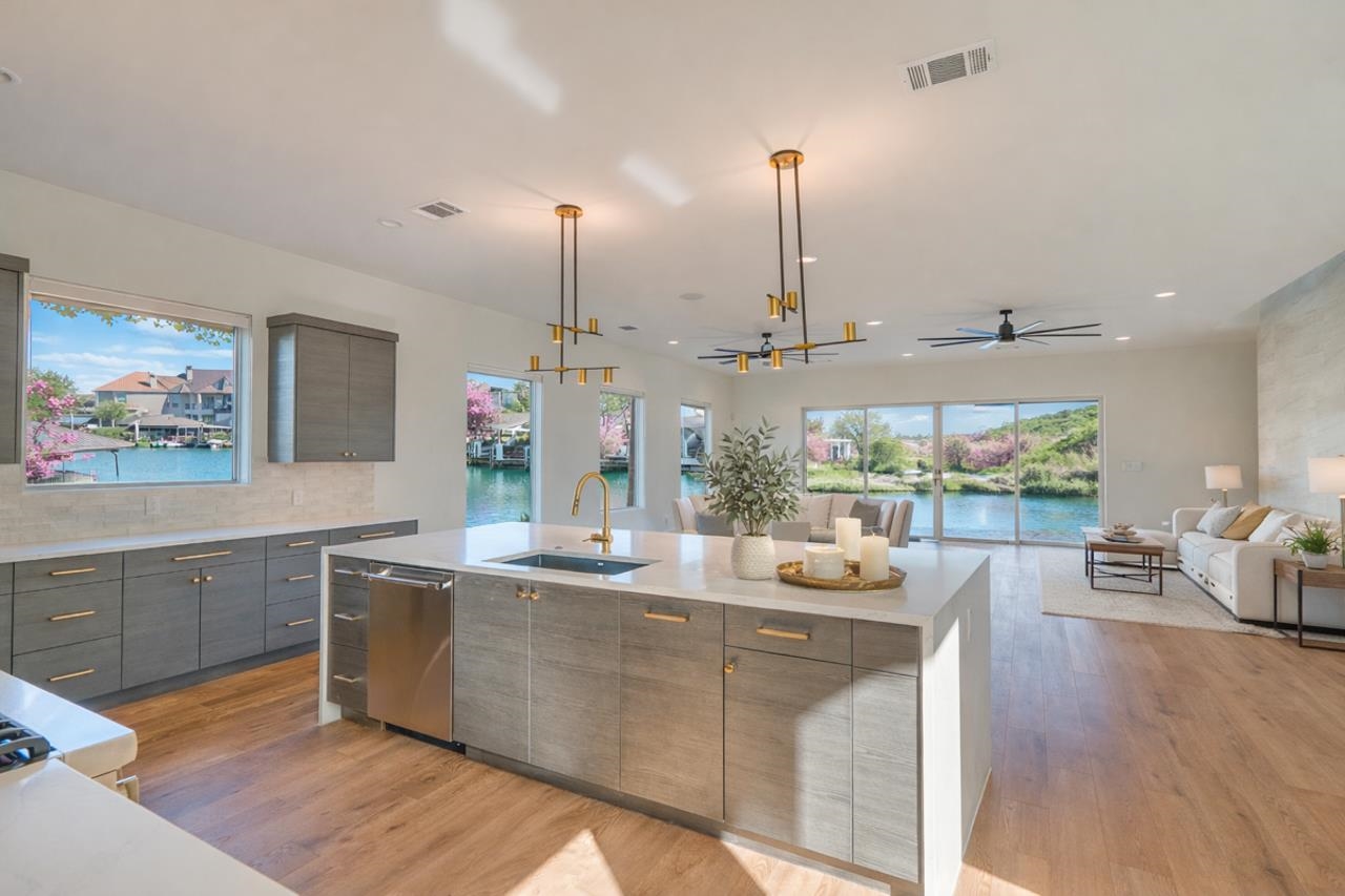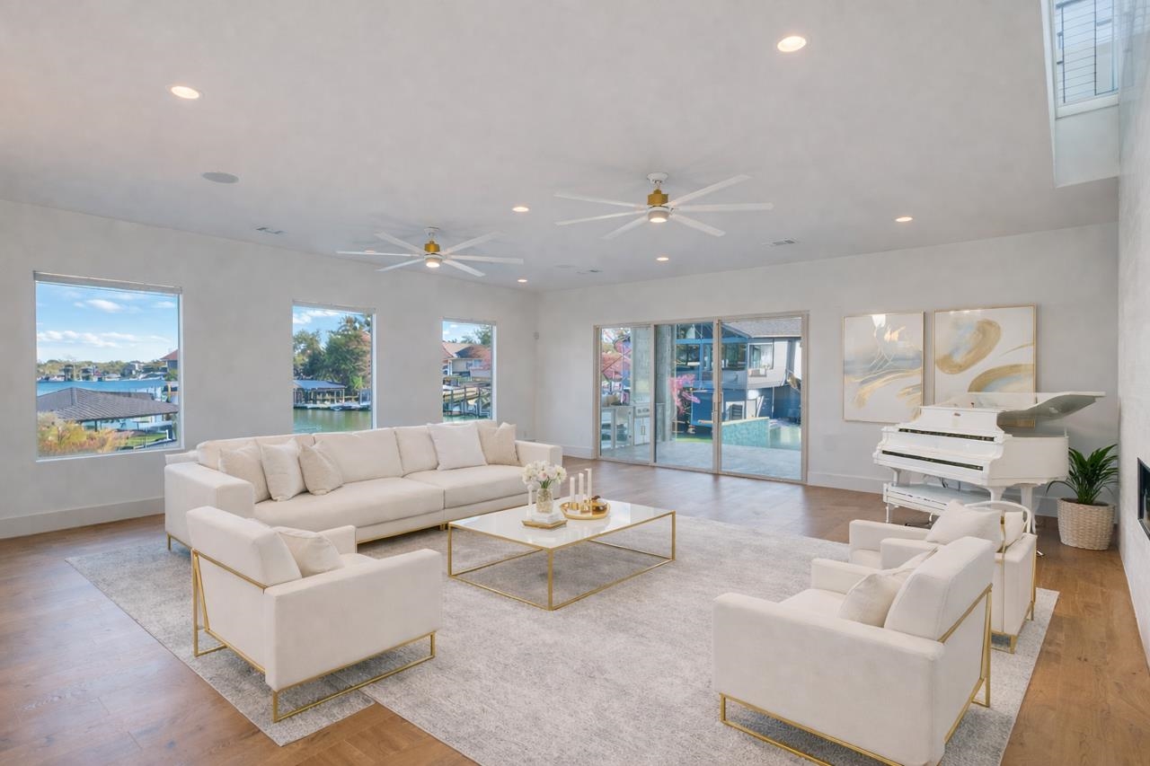 Waterfront home to be built by Neiman Foster Custom Homes in prestigious Horseshoe Bay West on a quiet cove with open-water views of Lake LBJ. This 4BR/4.5BA contemporary residence offers approximately two levels of thoughtfully designed living with panoramic lake views, private boathouse, jet ski parking, pool, and expansive sun deck. Open-concept great room features soaring ceilings, marble fireplace, floating second-story design, and walls of glass framing the water. Chef’s kitchen includes quartz countertops, two-tone cabinetry, Thermador appliance suite, wine cooler, butler’s pantry, and mudroom. Main-level lakeview primary suite offers spa-style bath with wet room and soaking tub, plus a private guest suite. Upstairs includes a second living area with wet bar, bunk room, two additional bedrooms, and two baths (one en-suite). Covered patio with outdoor kitchen and fireplace overlooks the pool and lake. Oversized 3-car garage. Buyer may customize this plan or design a custom home (pricing subject to change). Blueprint available; similar home available for tour.