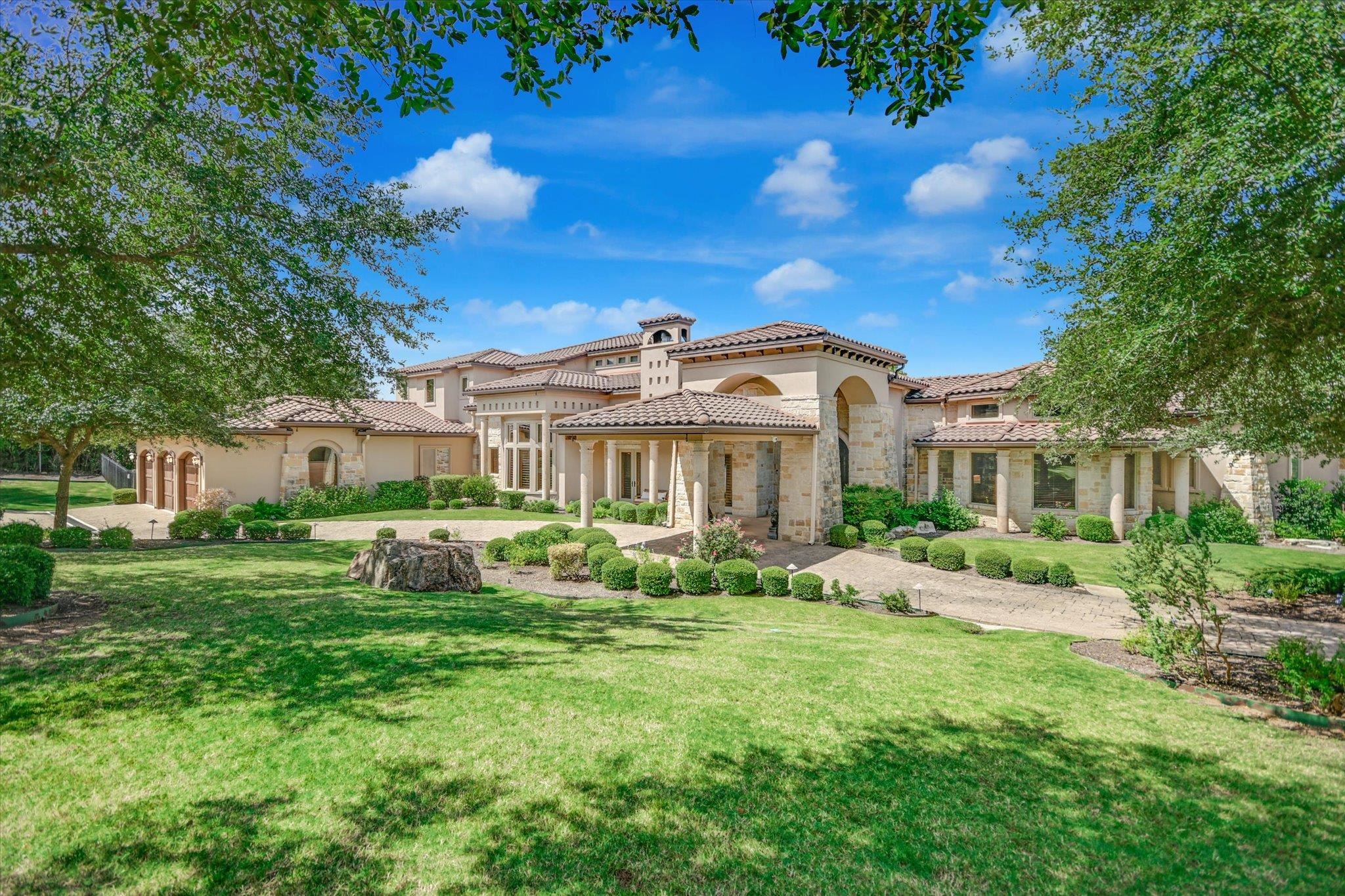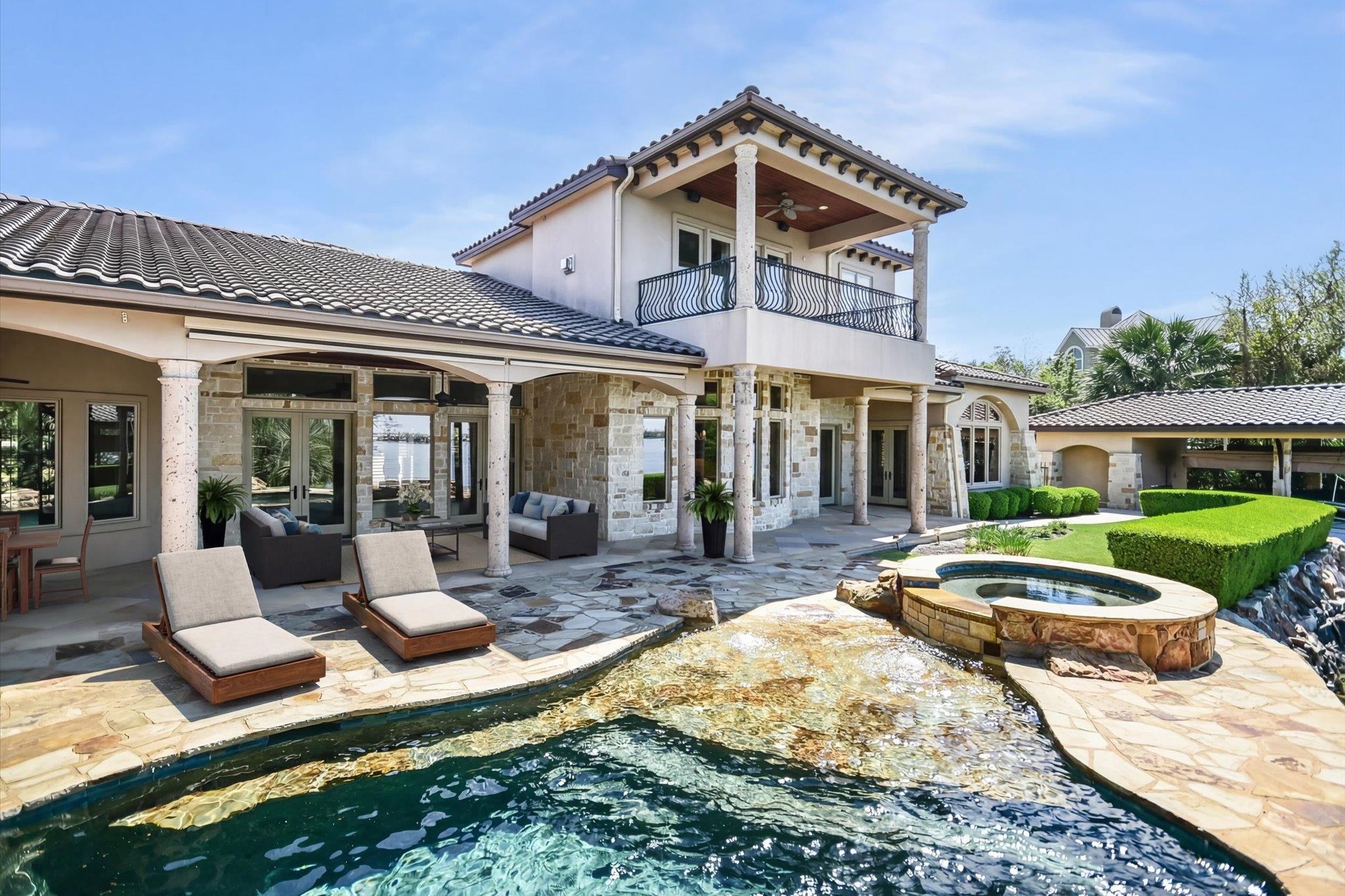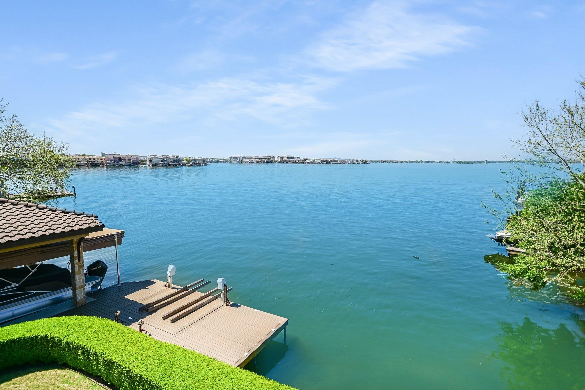 Positioned on 136 feet of prime open-water frontage along Lake LBJ, this custom Horseshoe Bay residence captures expansive lake views from nearly every room. Set on a quiet cul-de-sac and framed by lush, park-like landscaping, the property offers a private waterfront setting. Recently refreshed with a complete interior paint update, the home feels brighter and more in tune with its sun-filled surroundings. Soaring ceilings and walls of windows bring in natural light while connecting the living spaces to the lake beyond. Wood flooring anchors the main level, where the great room with a travertine fireplace flows into the dining area and kitchen. The kitchen is designed for everyday living and entertaining, featuring a large island, walk-in pantry, gas cooktop, double ovens, and Sub-Zero refrigerator. A casual dining area overlooks the water and enhances the lakefront setting. The main-level primary suite offers lake views, a sitting area, spa-style bath with dual vanities, soaking tub, walk-in shower, and generous closets, along with an exercise room. Two additional ensuite bedrooms, a study with fireplace, wine room, powder bath and laundry complete the main floor. Upstairs, two ensuite bedrooms and a media room with balcony all enjoy lake views. Outdoor living includes a covered patio, outdoor kitchen, and a resort-style pool with grotto waterfall and spa. The waterfront features a covered hydraulic boat slip with touchless cover, dual PWC lifts and composite decking. Schedule your private showing today.