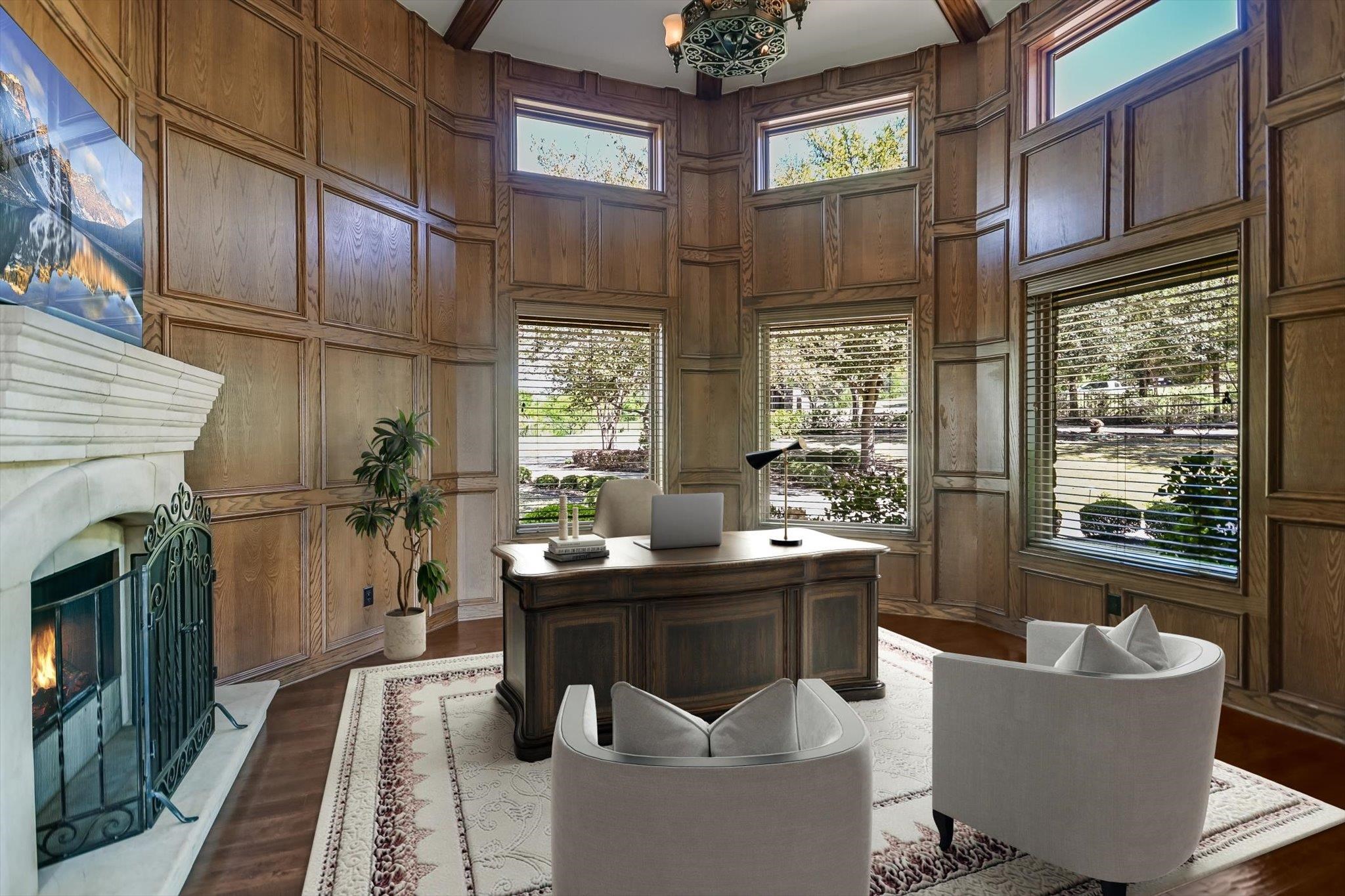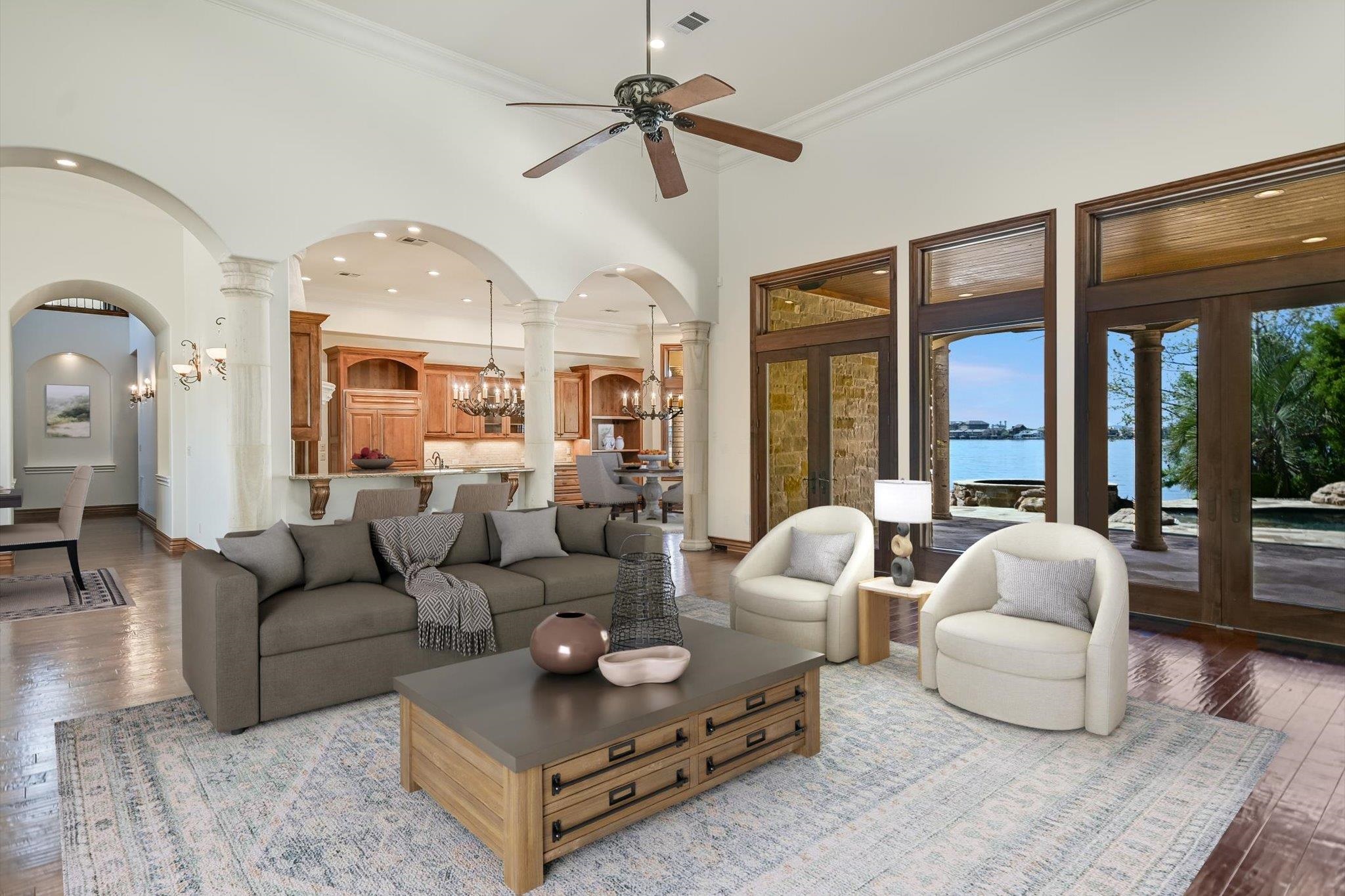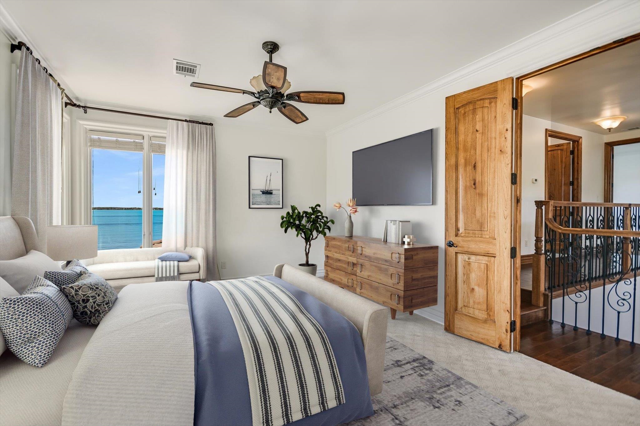 Positioned on 136 feet of prime open-water frontage along Lake LBJ, this custom Horseshoe Bay residence captures expansive lake views from nearly every room. Set on a quiet cul-de-sac and framed by lush, park-like landscaping, the property offers a private waterfront setting. Recently refreshed with a complete interior paint update, the home feels brighter and more in tune with its sun-filled surroundings. Soaring ceilings and walls of windows bring in natural light while connecting the living spaces to the lake beyond. Wood flooring anchors the main level, where the great room with a travertine fireplace flows into the dining area and kitchen. The kitchen is designed for everyday living and entertaining, featuring a large island, walk-in pantry, gas cooktop, double ovens, and Sub-Zero refrigerator. A casual dining area overlooks the water and enhances the lakefront setting. The main-level primary suite offers lake views, a sitting area, spa-style bath with dual vanities, soaking tub, walk-in shower, and generous closets, along with an exercise room. Two additional ensuite bedrooms, a study with fireplace, wine room, powder bath and laundry complete the main floor. Upstairs, two ensuite bedrooms and a media room with balcony all enjoy lake views. Outdoor living includes a covered patio, outdoor kitchen, and a resort-style pool with grotto waterfall and spa. The waterfront features a covered hydraulic boat slip with touchless cover, dual PWC lifts and composite decking. Schedule your private showing today.