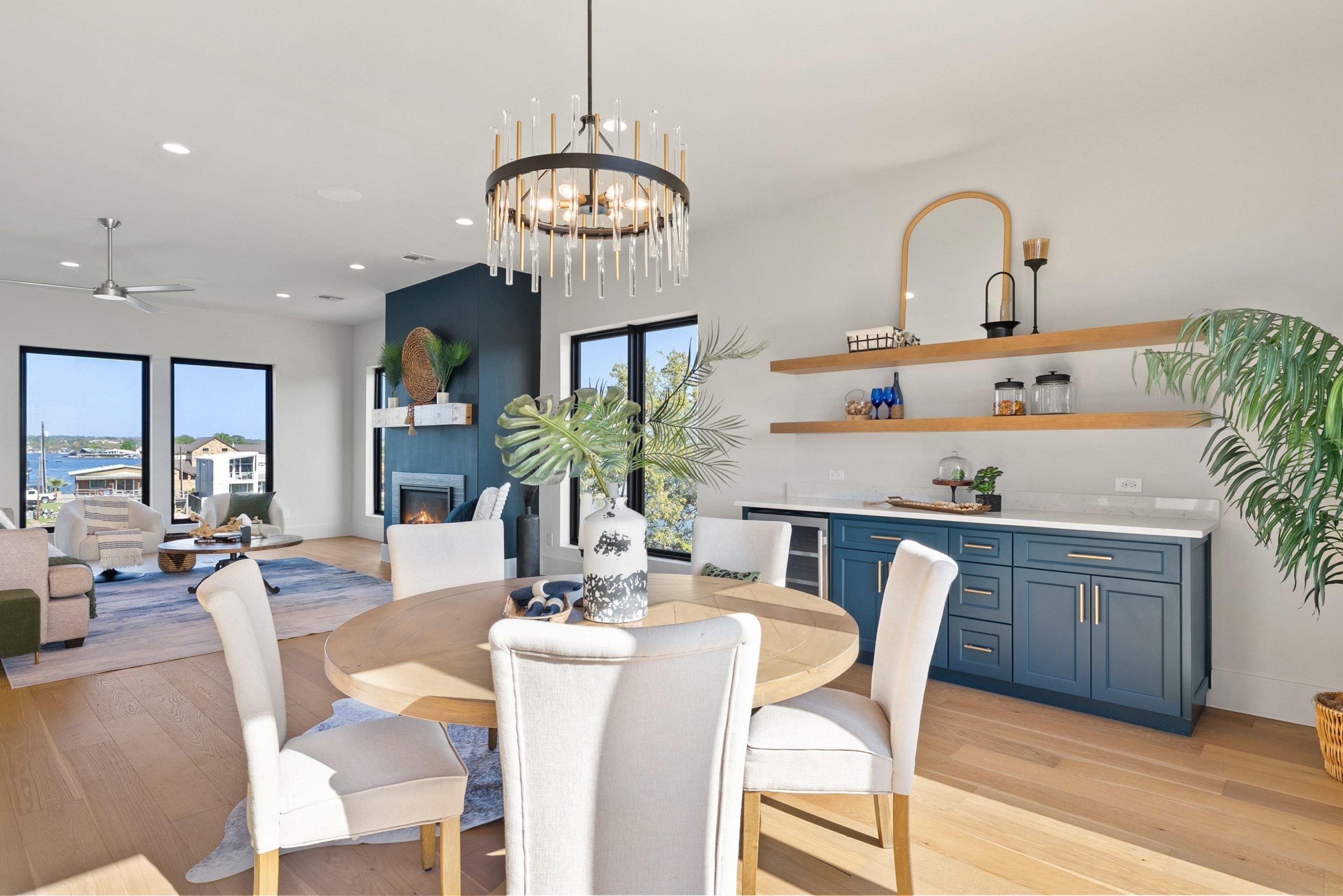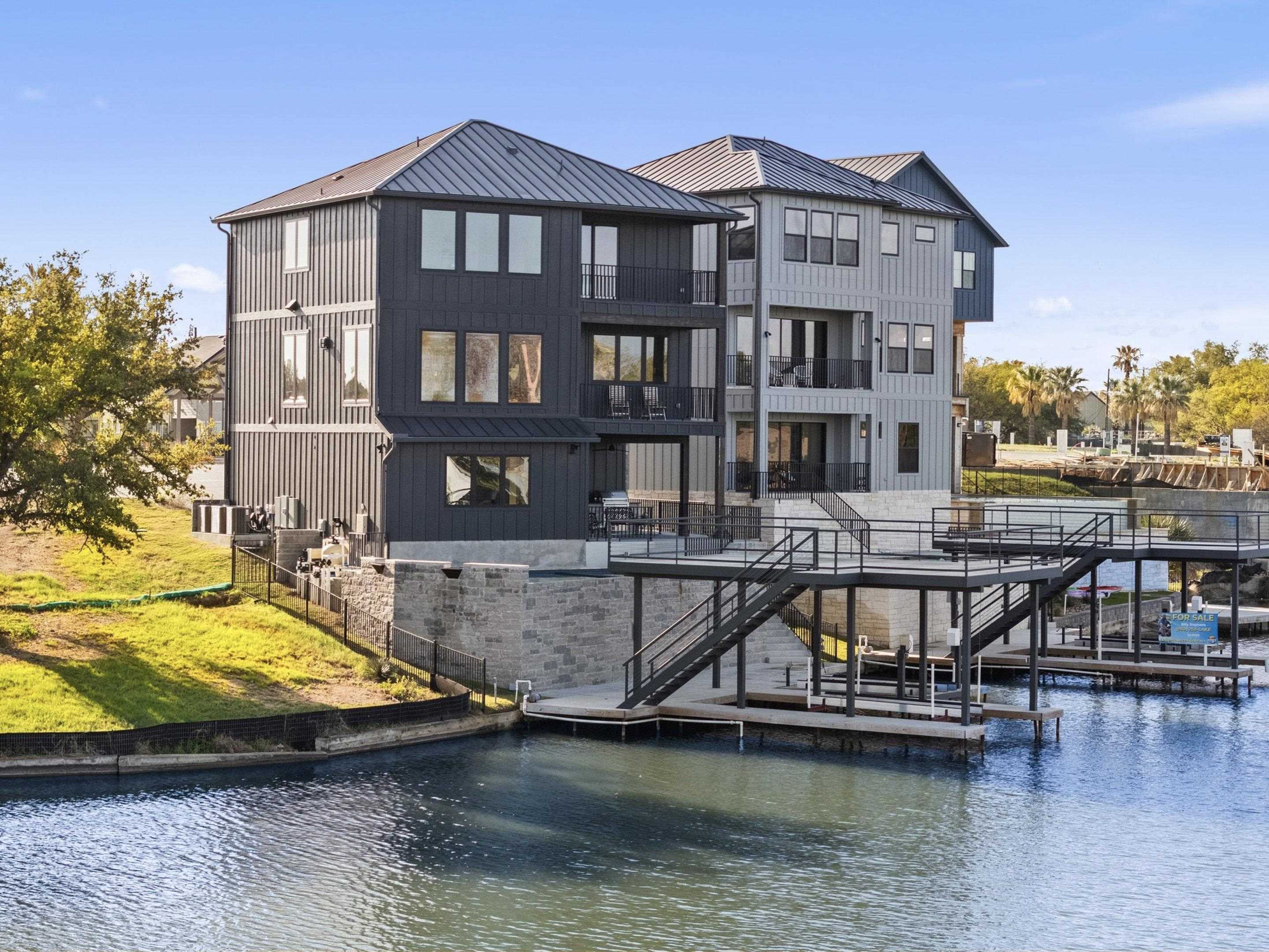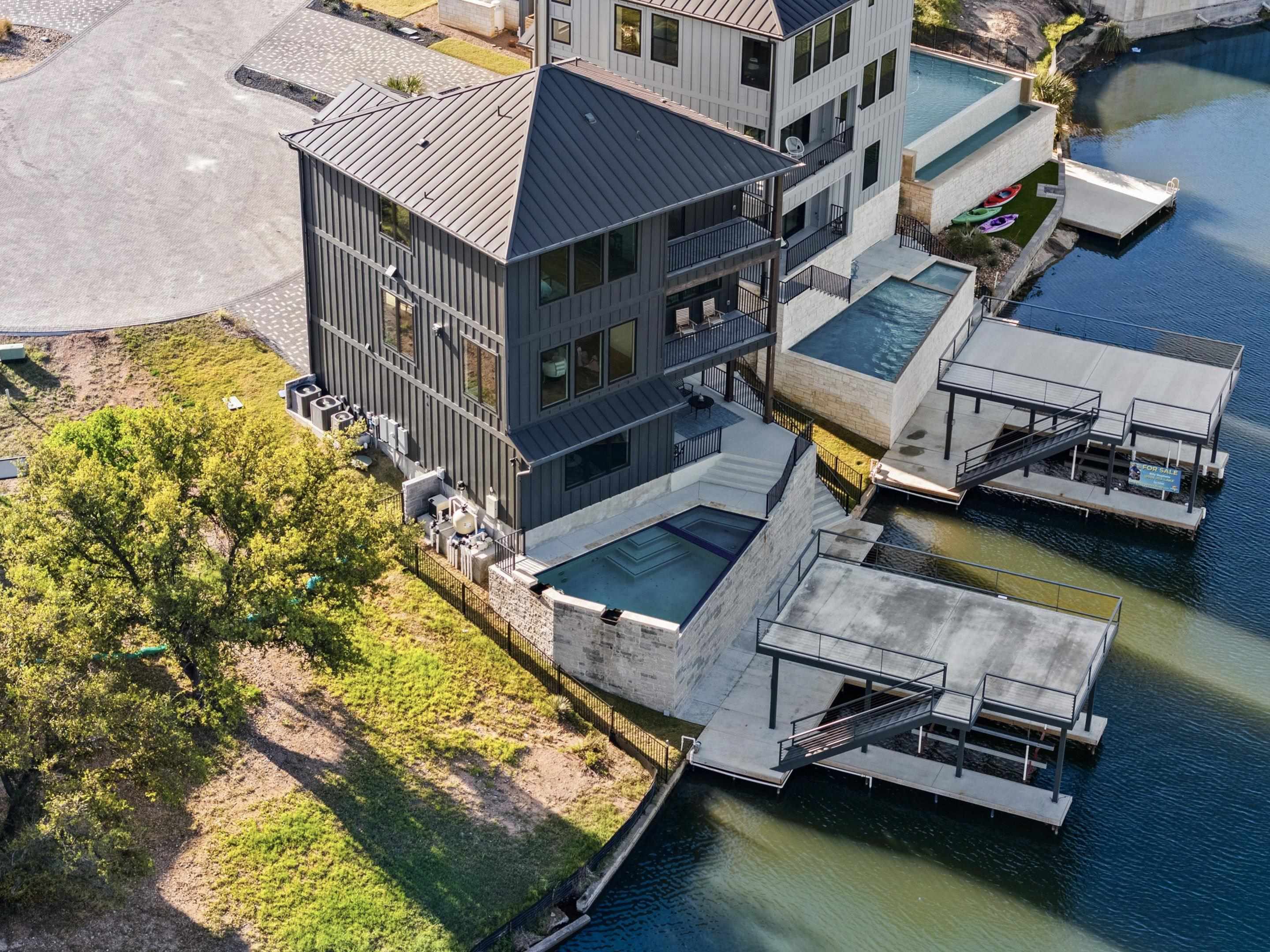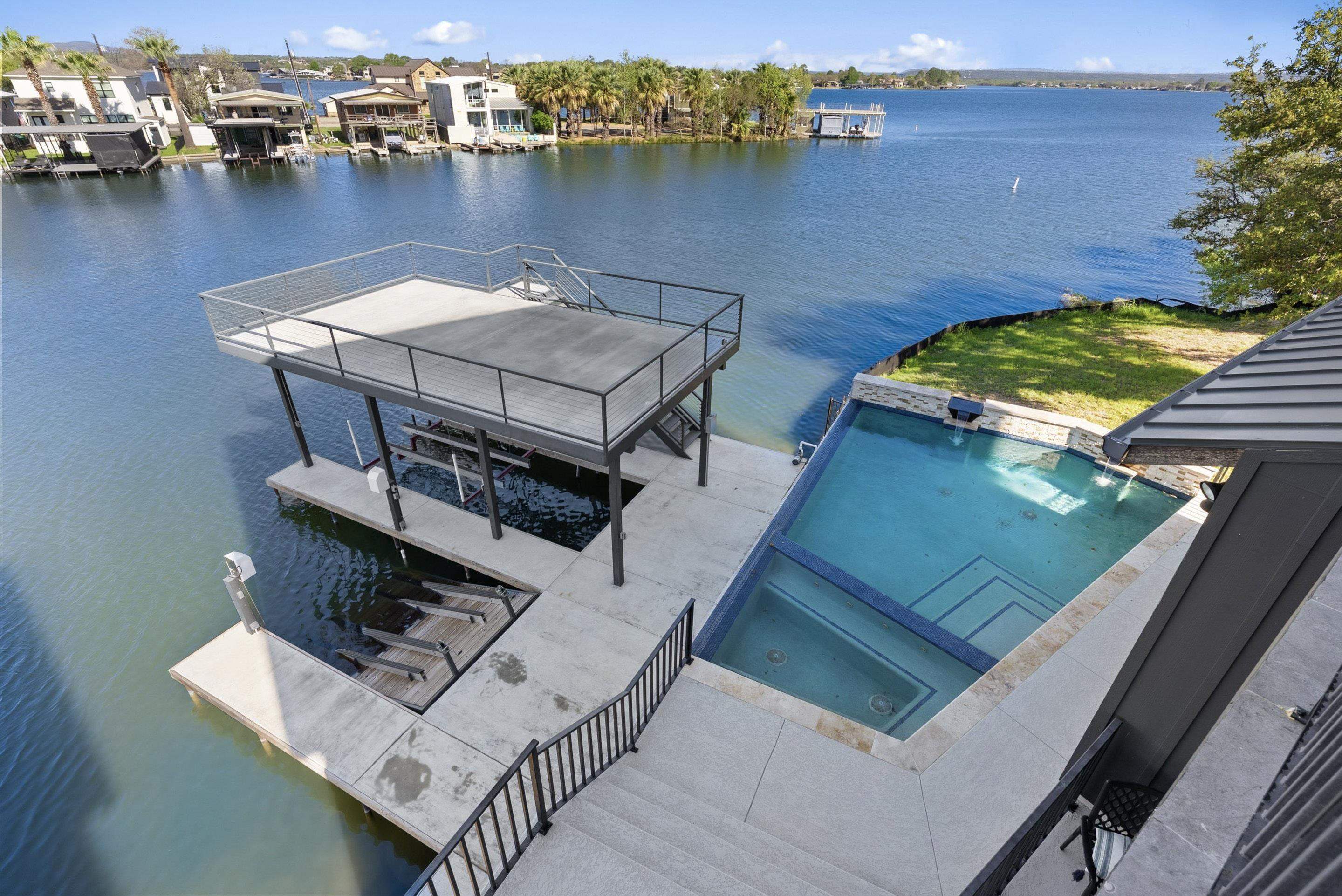 Brand-new waterfront home by Keith Wing Custom Builders with premium improvements already in place. This Lake LBJ property combines quality construction with a turnkey shoreline setup designed for real time on the water. The waterfront is fully equipped with a boathouse, lift, entertainment deck, double jet ski ramps, and dock access, making boating, swimming, and relaxing easy from the start. The backyard creates a true lake retreat with an infinity pool and hot tub overlooking open water, outdoor kitchen with gas grill and granite counters, and covered patios with cedar plank ceilings and built-in speakers. Inside, the home features large windows capturing lake views, solid wood doors, recessed lighting, and refined finishes throughout. An elevator provides convenient access between levels. The kitchen stands out with custom Michael Edwards cabinetry, quartz countertops, JennAir appliances, designer backsplash, 6-burner gas stove with double oven, pot filler, and farm sink, plus beverage fridge and open shelving. The owner’s suite offers expansive views of Lake LBJ, a spa-style bath, and walk-in closets, while the secondary bedroom includes balcony access, en suite bath, and water views. Waterfront improvements. New construction. Lake LBJ lifestyle ready to enjoy.
