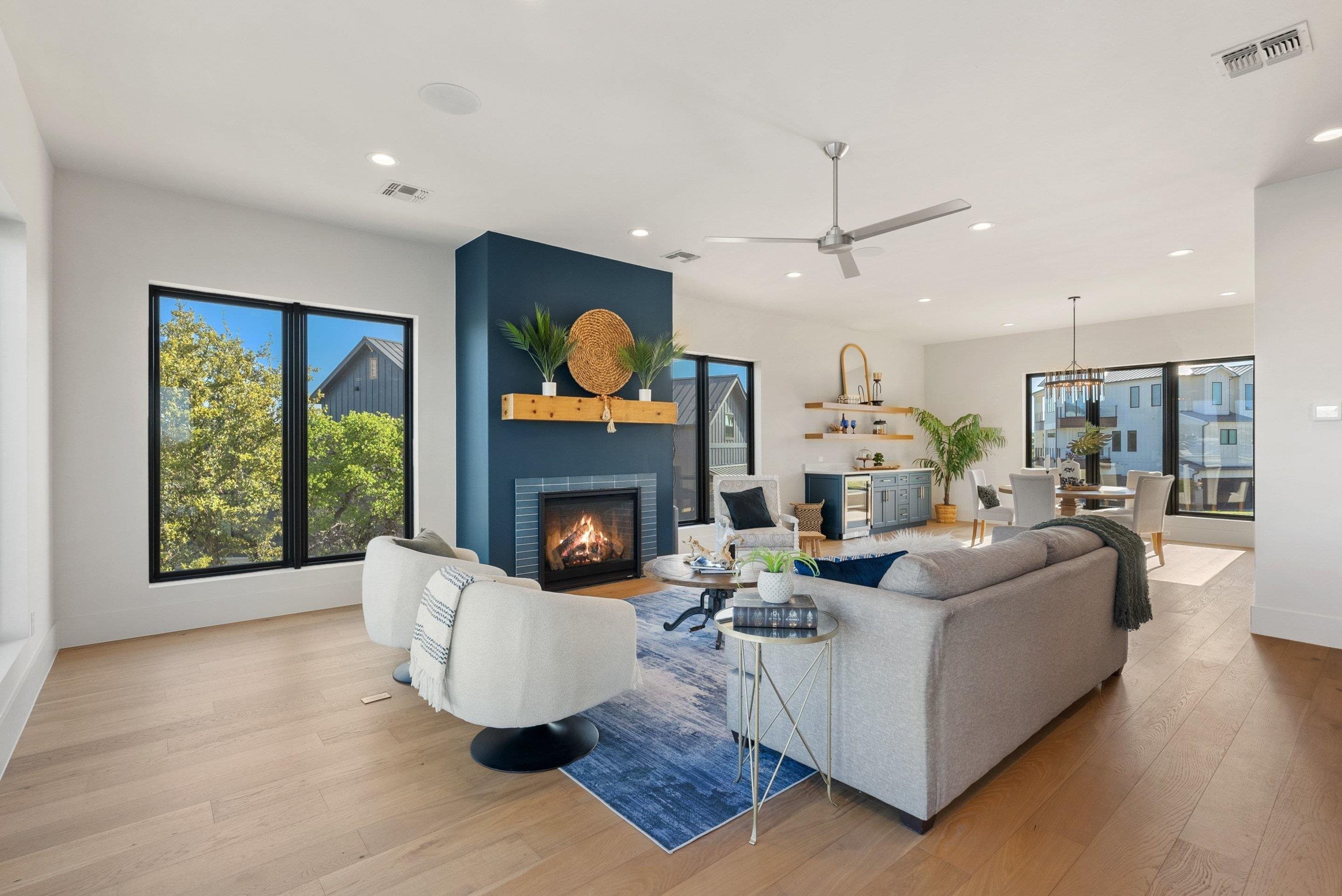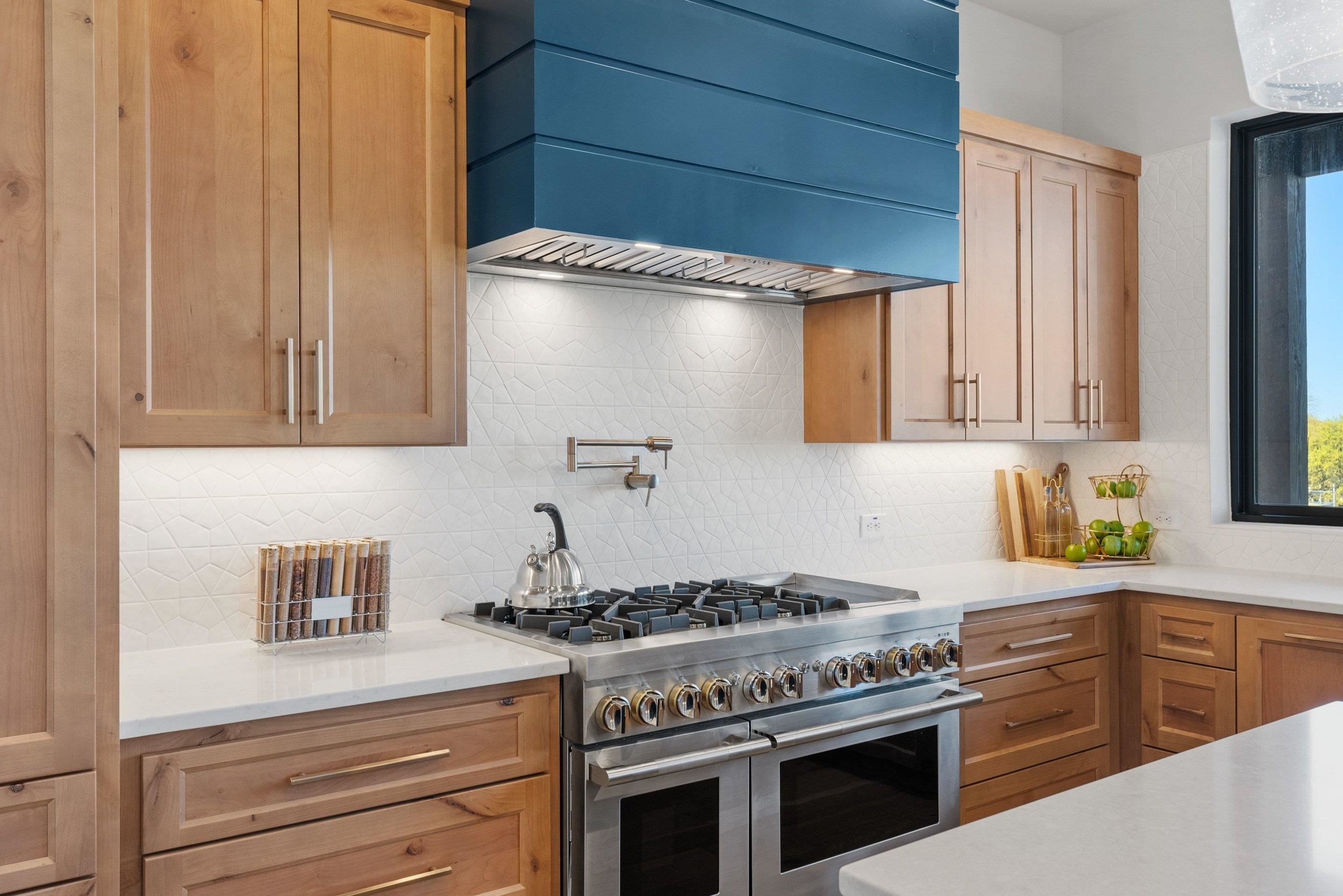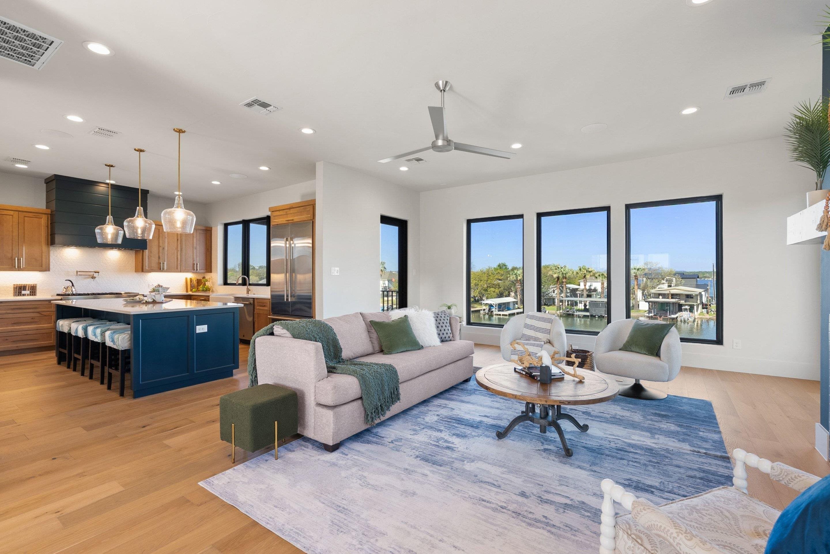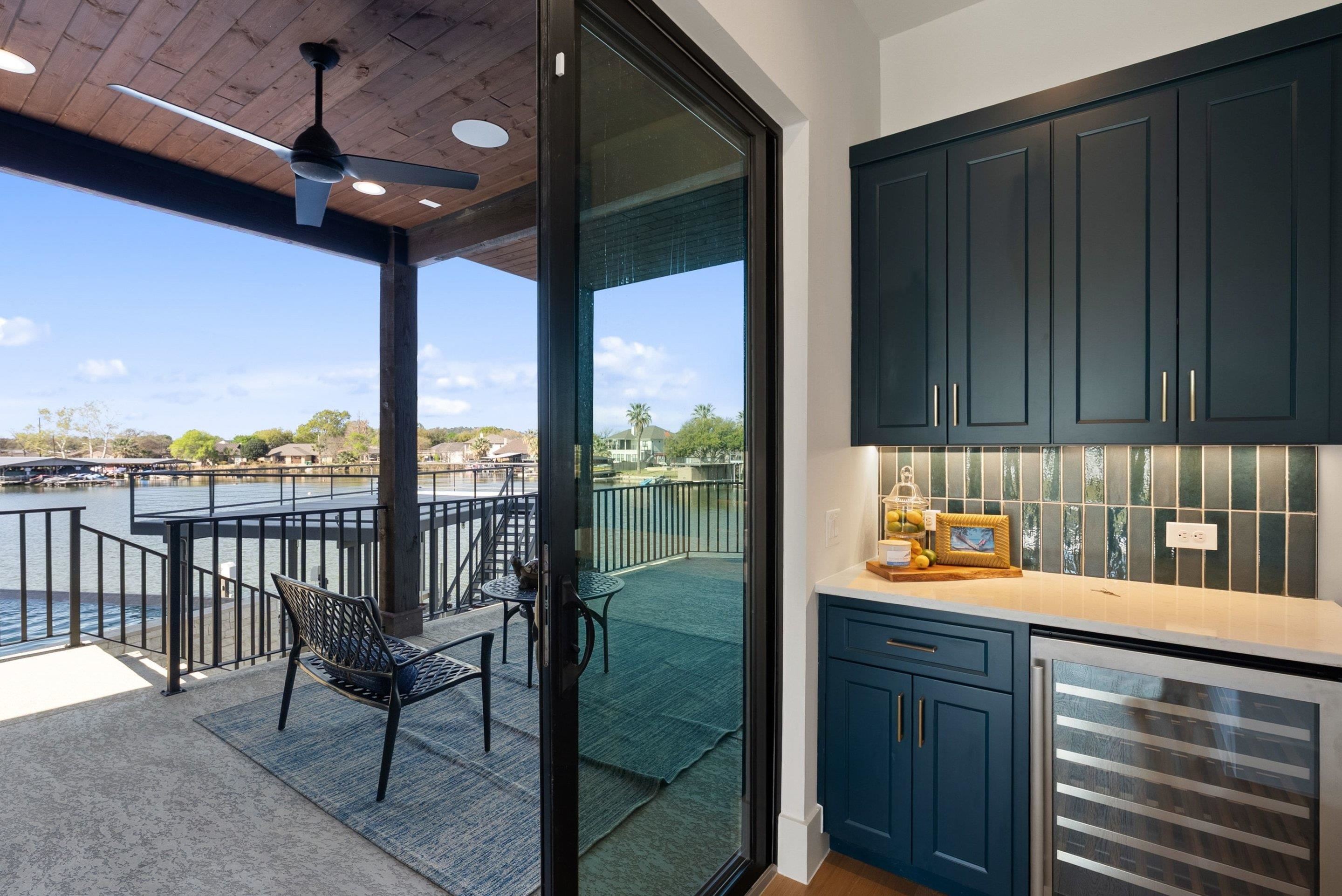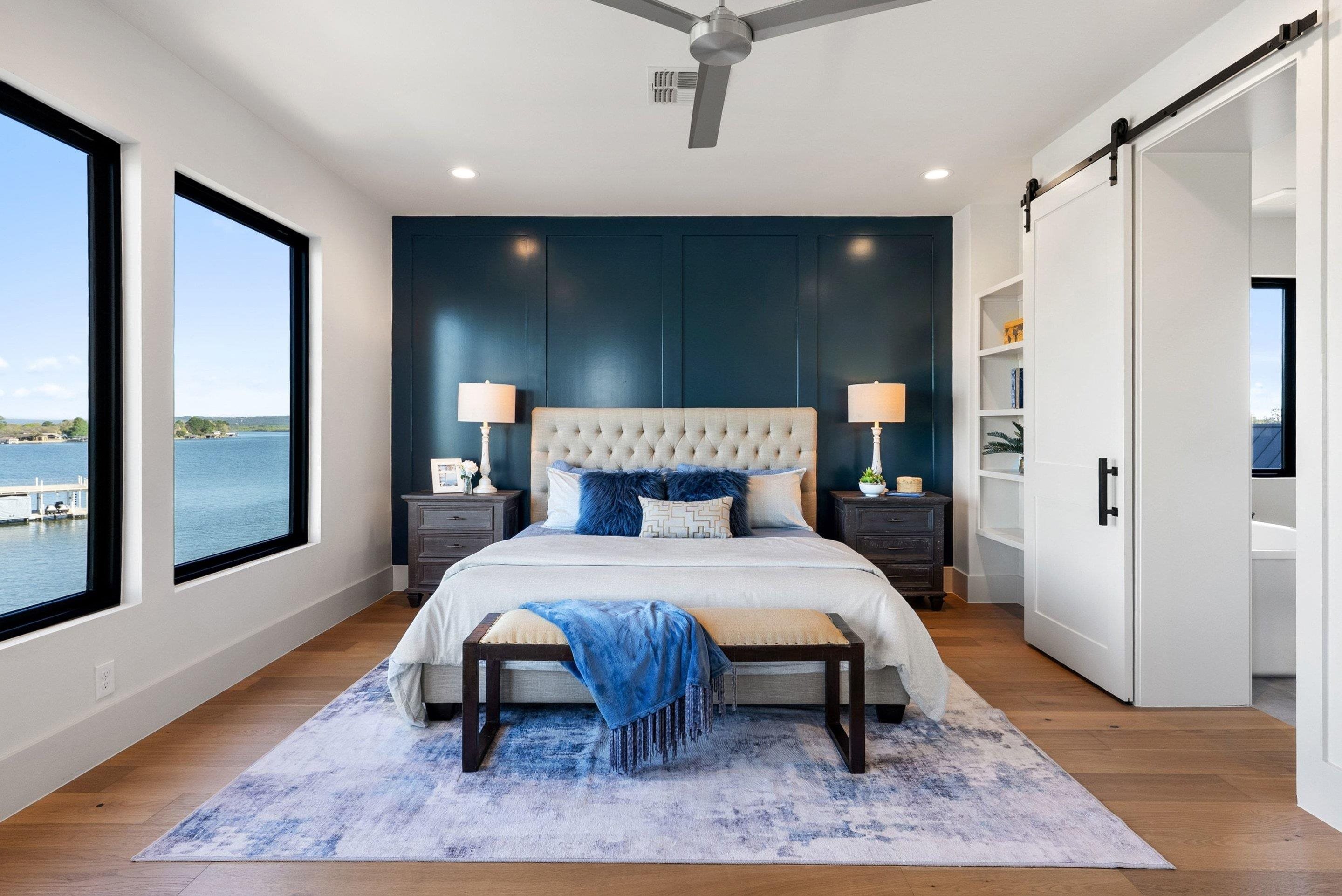 Brand-new waterfront home by Keith Wing Custom Builders with premium improvements already in place. This Lake LBJ property combines quality construction with a turnkey shoreline setup designed for real time on the water. The waterfront is fully equipped with a boathouse, lift, entertainment deck, double jet ski ramps, and dock access, making boating, swimming, and relaxing easy from the start. The backyard creates a true lake retreat with an infinity pool and hot tub overlooking open water, outdoor kitchen with gas grill and granite counters, and covered patios with cedar plank ceilings and built-in speakers. Inside, the home features large windows capturing lake views, solid wood doors, recessed lighting, and refined finishes throughout. An elevator provides convenient access between levels. The kitchen stands out with custom Michael Edwards cabinetry, quartz countertops, JennAir appliances, designer backsplash, 6-burner gas stove with double oven, pot filler, and farm sink, plus beverage fridge and open shelving. The owner’s suite offers expansive views of Lake LBJ, a spa-style bath, and walk-in closets, while the secondary bedroom includes balcony access, en suite bath, and water views. Waterfront improvements. New construction. Lake LBJ lifestyle ready to enjoy.