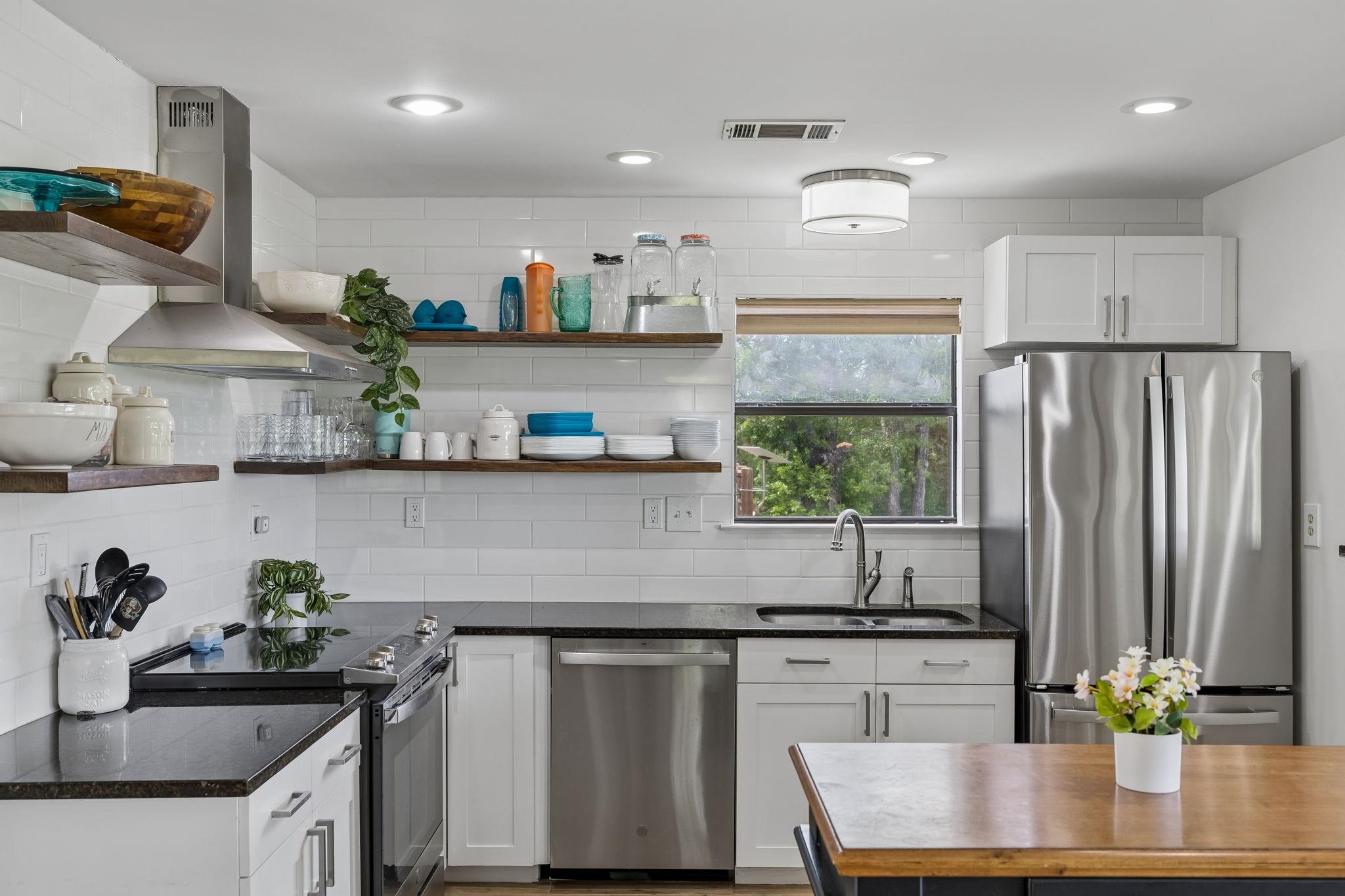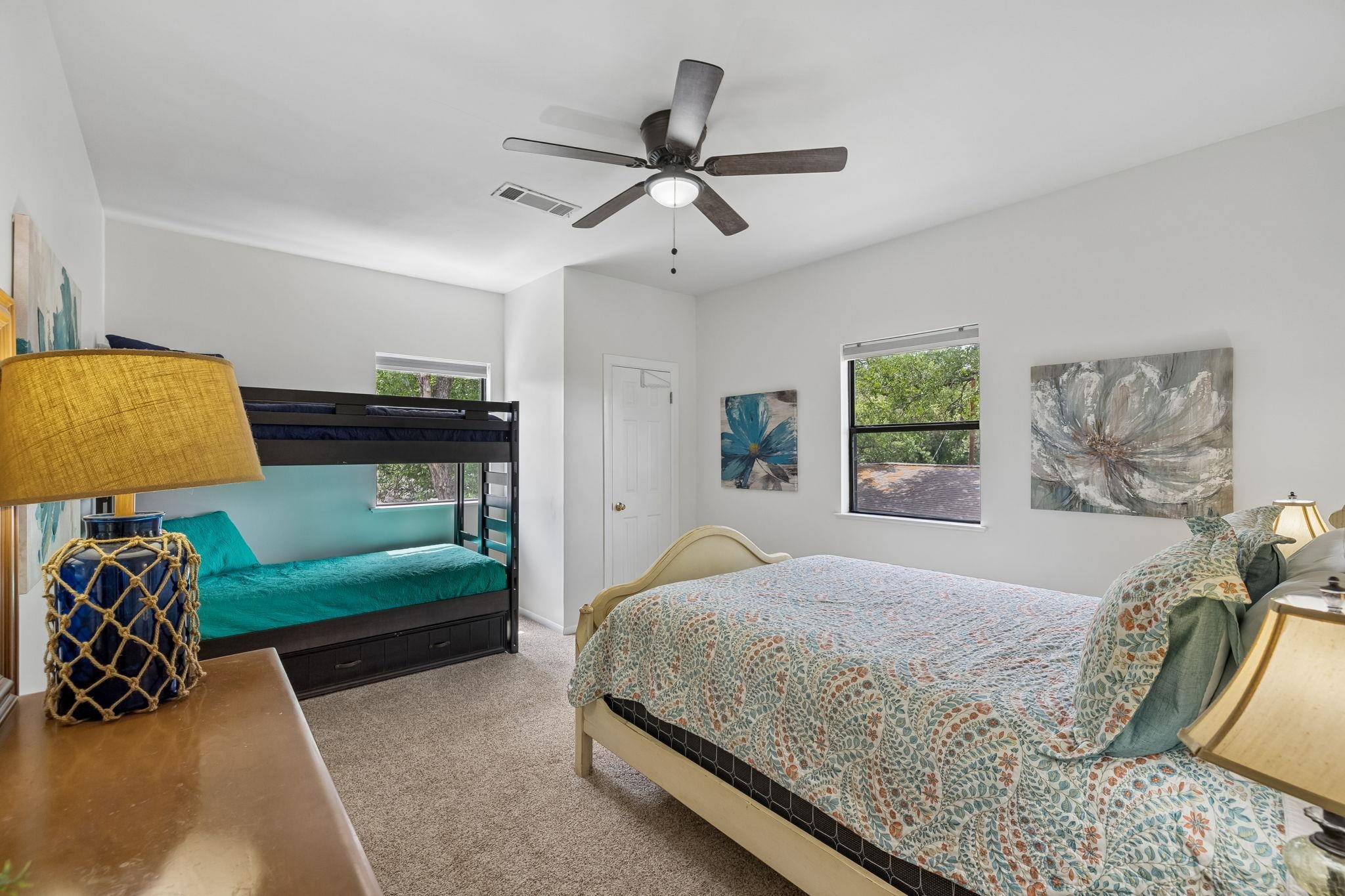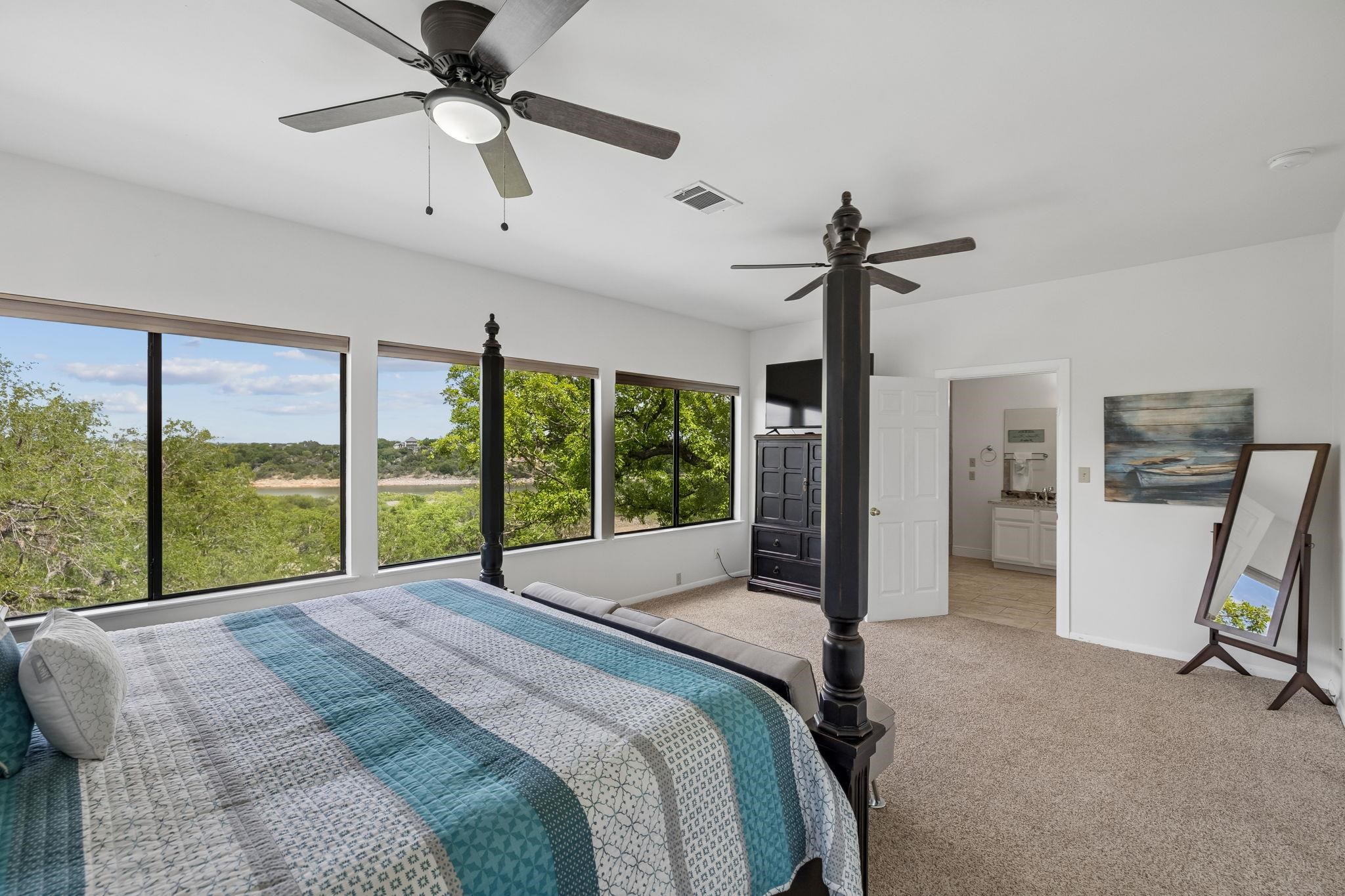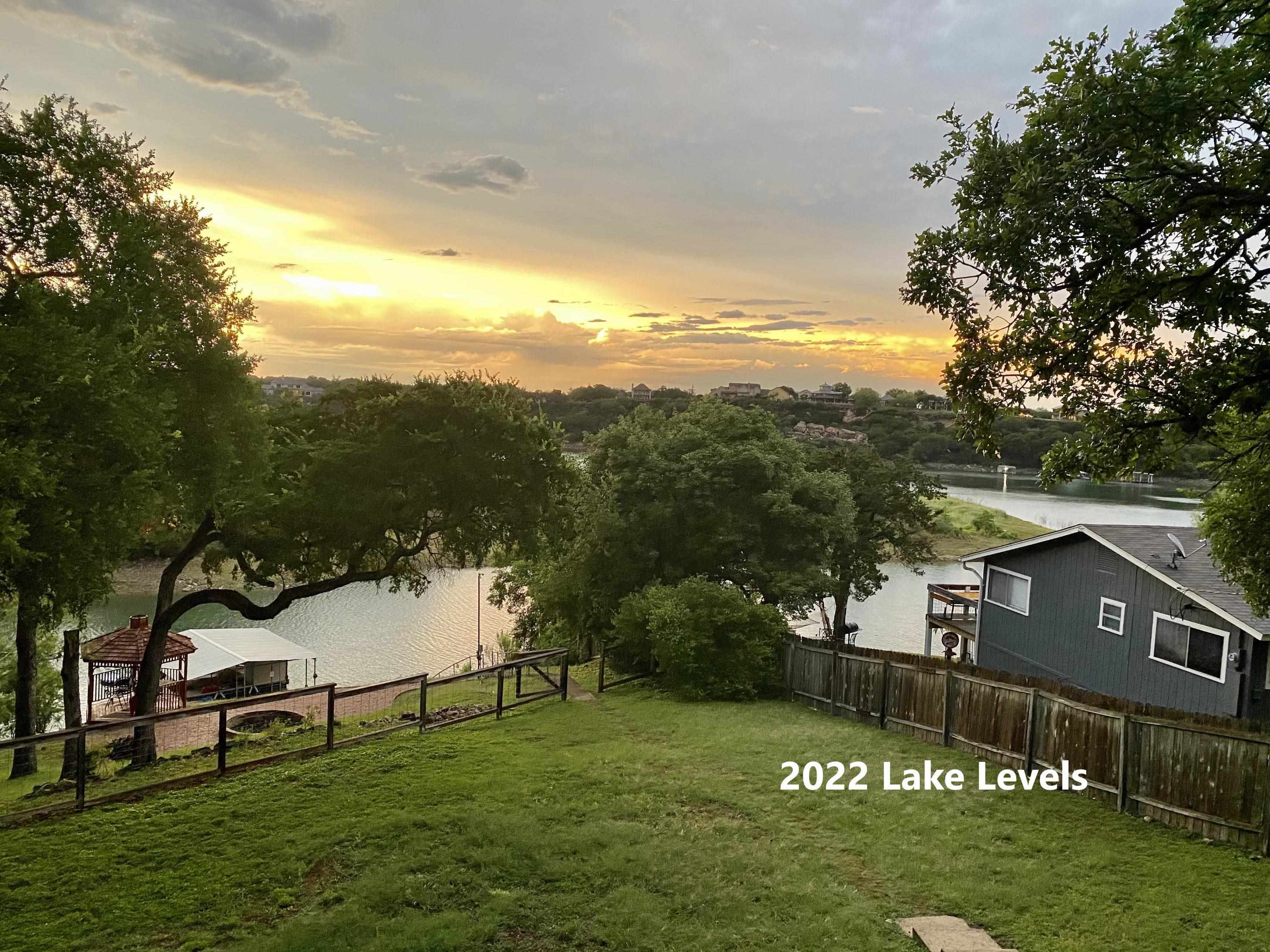 Lake Travis waterfront property offering improved shoreline, direct water access, and a floating boathouse with double boat slip ready for boating and lake recreation. Set on approximately 0.72 acres, the property features concrete steps to the water, terraced landscaping, exterior lighting, and open views across the lake with natural scenery instead of neighboring homes. Outdoor spaces include a partially covered balcony with built-in seating, fire pit area, and mature trees providing shade and privacy. The interior layout is designed for comfortable everyday living and entertaining with an open floor plan, durable tile flooring, recessed lighting, and large picture windows showcasing the lake. The kitchen offers granite countertops, stainless appliances, center island, and abundant cabinetry. The primary bedroom overlooks the water and includes a soaking tub, walk-in tile shower, and double vanity. Secondary bedrooms provide flexible sleeping space and storage for guests and family.